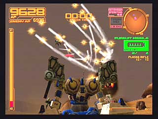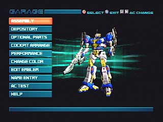 − ARMORED CORE 2 − プレーヤーはテラフォーミングにより火星に人類が移住している未来に、ARMORED COREと呼ばれる機体を操る傭兵(レイヴン)として活動する事になります。 ゲームは基本的にミッションとアリーナで成り立っています。 ミッションでは傭兵として企業に雇われて仕事をこなし、成功すれば報奨金を受け取る事ができます。 アリーナでは先輩レイヴン達と対戦し、勝ち上がる毎に賞金や賞品を受け取ることができます。 ゲームの進め方はプレーヤー次第で、まずアリーナで賞金を稼いでミッションを行う事もできますし、ミッションのみクリアしてから改めてアリーナに挑戦する事も可能です。 ところでこのゲーム、普通のロボット・アクションシューティングものと異なり、機体を組み上げるという作業がゲーム中、大きなウエイトを占めています。 プレーヤーが使用するACは様々な部品から成り立っており、頭部、コア、腕部、脚部、ジェネレーター、ラジエーター、FCS、ブースター、インサイド、エクステンション、左右肩装備、左右腕装備、オプショナルパーツという沢山の箇所を数百点ものパーツから選択して組み上げる必要が有るのです。 これらのパーツにはそれぞれ耐久力、重量、最大荷重、消費エネルギー他多岐に渡る詳細なパラメーターが有り、良いパーツはやはり値段もそれなりに高値になっています。 これらのパラメーターや部品の形状、種類などのデータについては、とても一個人のサイトで書ききれる量では無い程膨大なものがありますが、それらを把握しつつミッションや対戦相手に最適な機体を組み上げるのが、このゲーム最大の醍醐味のような気がします。 例えば技術の無いパイロットでも、最適な機体でミッションorアリーナに望めば、かなりの確率で完遂or勝利する事ができる程機体組み上げは大きなウエイトを占めています。 もし操縦テクニックが高いプレーヤーなら、相手が重量級タンク+キャノン系装備だった場合、軽量級二脚+マシンガンの機体で相手を翻弄しつつAPを削っていくという戦術が使えますし、逆に腕に自信がないプレーヤーなら相手の隙を突くような機体、例えばミサイルメインの軽量機体が相手の場合、ミサイル迎撃装備+重装甲タンク+グレネード系大火力で楽に勝てる事が有ります。 しかしこれらのデーターや機体操作の説明を行うはずの付属マニュアルはとても貧粗且つ役に立たない代物で、詳細なパーツ説明、戦術説明のあるオフィシャルガイドブックは必須な様な気がします(笑)。 またミッションの各ステージには隠しパーツが多数存在するのですが、それらの殆どは到底まともにプレイしていては発見不可能に思えるものばかりで、どうもガイドブックを持たない者は損して当然みたいな感じを受けるのは私だけでしょうか。 ていうか隠しパーツを隠しすぎ!?(笑) もしガイドブック無しでミッションを軽々クリア、隠しパーツも簡単に見つけたゼ!見たいな人が居れば、きっとその人はニュータイプに違い有りません(爆)。 実際のゲームプレイですが、OPはフルCGで格好いいのですが、その後の引きがかなり弱い印象が有ります。 ストーリー性は無くは無いのですが、殆ど感情移入させようと言う工夫が有りませんし、またそれが語られていることも無く、まあ無きに等しいという感じです(笑)。 結局無味乾燥なプレイに成るわけですが、時折来るメールが少しは刺激になるという感じでしょうか。 プレイした感じ全体的に淡泊な感じで、データ命的な要素も多く、コンシューマゲームには珍しく硬派というか、メーカーがこだわって作ったという印象も受けました。 と言ってもPS2でプレイしたゲームでは初めて激しい駒落ちを経験し、それ程美麗という画面でもないのになぜ!?と思う事も有りました。 CPUパワーに余裕が有るときはFSAAを行い、処理が重くなるとFSAAを外すなどの対策も行っている感じですが、やはりソフトウエア的にまだPS2に最適化されていないのでしょうか・・・ また今現在なぜか右肩装備が使えないとか(まさか一度クリアしたプレーヤーへのハンディキャップ?)、たまにハングアップするとか言う事も有ります。 操作体系も、ロックオン対象を中心に自機を機動させるシステムを採用しているガンダムやZ.O.Eと比べるとかなり使いづらい印象で、せっかくのスティックも何にも生かされていないのが残念です。 前でも書いていますが全体的にユーザーフレンドリーさに欠けている印象を受けたのは残念です。 悪く言えば独りよがりなシステムというか・・・ 良く取れば前作のフアンの為に最適化されているというか。 しかしそれ以外ではやはり機体組み上げ作業がかなり面白く、対戦相手機体の特徴を考えながら効果的なパーツの組み合わせを考えたり、慣れにくい操作系も慣れればそれなりにアクションを取れるようになる事から、このゲーム自体の評価は結構自分の中では高くなっています。 アリーナ限定ながらリプレイが有