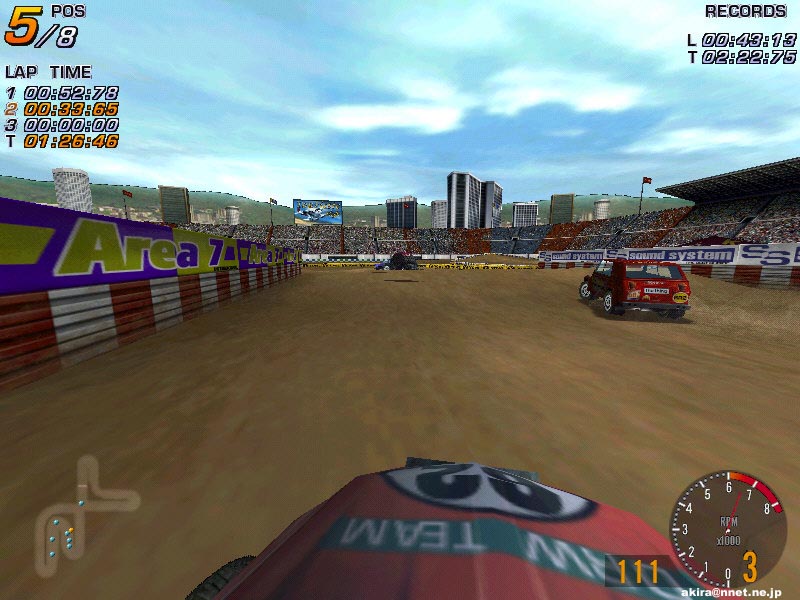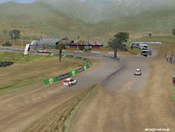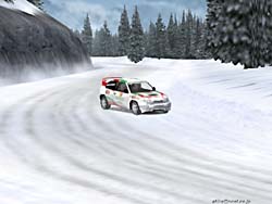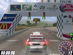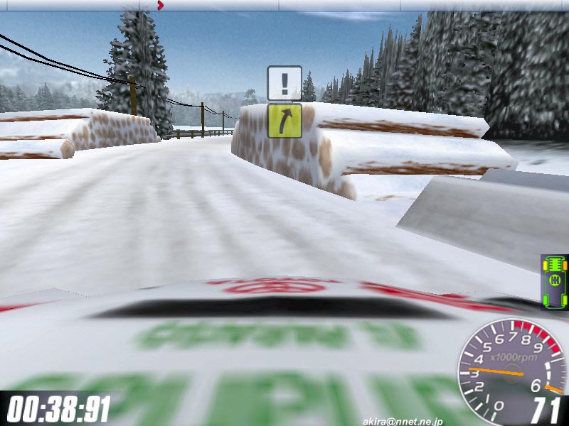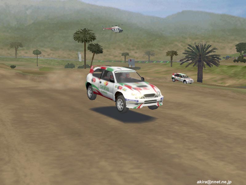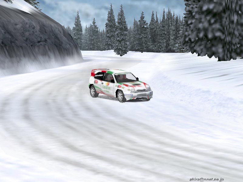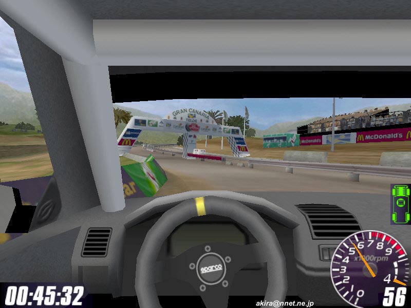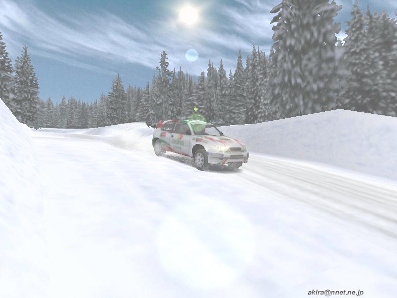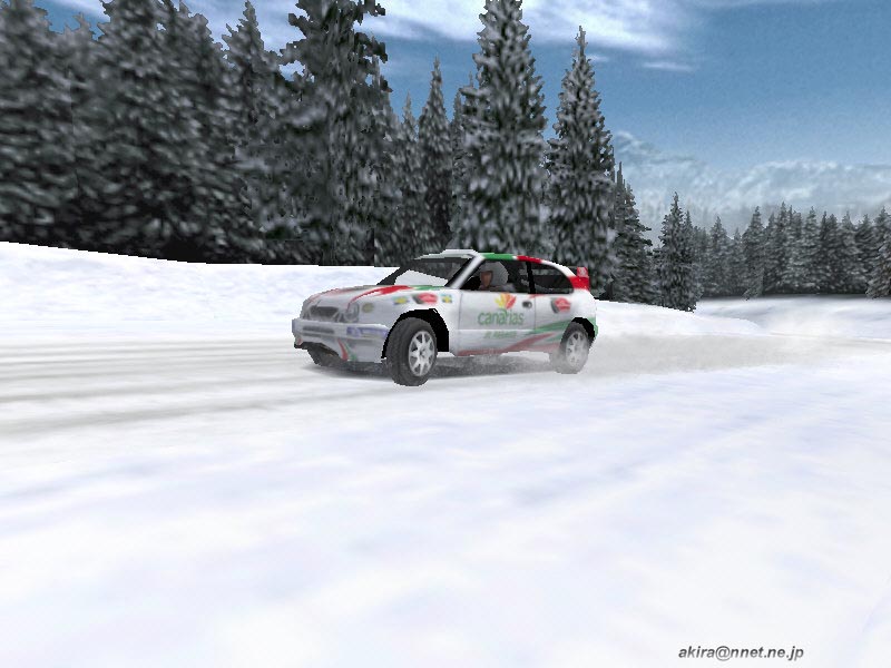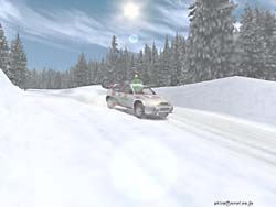 ☆ゲーム内容 レースゲームファンが首を長くして待っていたタイトルのDEMOがようやっとリリースされました。 DEMOで選択できるゲームモードはRACE OF CHAMPIONSHIPとSINGLE PLAYERのみで、RACE OF CHAMPIONSHIPではカナリア島SSSを、SINGLE PLAYERではスエディッシュコースを走行可能です。 車は何れもカローラWRCのみ選択可能です。 このDEMOは時間制限等は有りませんし、リプレイも有ります(保存は出来ません)。 ☆オプション類 オプション類は標準的なもので、グラフィックスの設定、サウンド、コントローラ、難易度の設定が可能です。 グラフィックス(解像度&色数)の設定は別ユーティリティで行い、TNT2Uの場合640x480x16bitから1240x1024x32bitまで設定可能です。 ユーティリティの方ではトリプルバッファリングやトライリニアフィルタリング等基本的な設定しか出来ず、テクスチャディテール等の変更はゲーム中で行います。 しかしそれ程細かい設定はできません。 サウンドはDirectSound3DからA3D,EAXまで設定可能です。 後は音量程度。 コントロールは市場に出回っているかなりの数のデバイス名から選択できます。 簡単と言えば簡単ですが、汎用性に乏しいとも言えますね。 そこそこの設定は出来ます。 ☆グラフィックス グラフィックスですが、見た目的にはやはり前評判通りのまずまずのレベルと言ったところです。 周囲のオブジェクトは結構有る方ですが、テクスチャがRC2000(MRC)の様な実写風ではなく、ちょっと安っぽい(例えばV-RALLYの様な)原色系な色彩なのが残念です。 また車体グラフィックスも今となっては「うーん・・・」と唸ってしまうレベルですね。 一年前にリリースされたSEGA RALLY2に及んでいません。 車体に割いているポリゴン数やモデリングはともかく、テクスチャが貧弱な感じです。 まるでSEGA RALLY2をVRAMの少ないD3Dカードでプレイした時になる、ぼけたテクスチャと言った感じです。 まあ景色とマッチしてこれで良いバランスなのかもしれません。 しかしダメージを受けたところはそれなりに破損しますし、車内も見れますしまあ問題は無いレベルでしょう。 もっとも悪い事ばかりでは有りません(笑)。 グラフィックスのレベルは少々低いですが、お陰で高解像度32bitでも余裕の描画速度を誇ります。 最近のゲームは私の環境では重くなりつつ有る中で、これはありがたいことです。 さらに車体や車輪の挙動は結構リアルなものとなっています。 路面変化の激しい所でのリプレイを見ていると、四輪が独立して見事に路面からの衝撃に対応している様が見て取れ、なかなか良い感じです。 視点は全画面、ボンネット、ドライバー、追尾x2,TV。 ドライバー視点では車内が再現されていますが、CMR程のリアルさが有りません。 どちらかと言えば簡易な感じで、CMR並みかそれ以下といった印象です。 しかしリプレイも有りますし、まあ及第点だと思います。 ☆サウンド A3D、DS3D、EAXに対応しており、上空を飛ぶヘリの音とかがリアルです。 エンジン音やロードノイズ、ナビの声もクリアーで問題なし。 しかしエンジン音にもう少し迫力が有れば・・・と思いました。 ☆コントロール 操作はキーボードや各種コントローラが使用できます。 オプションの項目でも挙げたとおり、設定も不満は有りません。 コントロール性もとても良い感じで、MRC(RC2000)よりイージー(イージーモードですが)でSEGA RALLY2に近いアーケードな感触です。 これがリアルな挙動かと言われるとちょっと迷ってしまいますが、走っていて最初にMRCをプレイした時の様な違和感はありませんでしたし、コーナーリングも気持ちよくドリフトを決めることができます。 この辺り流石Motorheadを作成した会社だけ有るなという印象です。 しかもMotorheadよりかなり爽快感重視で、MRCをプレイして切れかけた人様のヒーリングに是非、と言った感じです(笑)。 ☆ゲーム性 カナリア島SSSではライバル車と二台同時スタートですが、相手が見えると言うことはあまり有りません。 しかしエンジン音が遠ざかったり近づいたりする事で、結構競争心を煽られます(笑)。 またコースレイアウトもジャンプ有り、立体交差有りで走っていて面白いですね。 注文があるとすれば、もうちょっとコーナーアウト側を広くして貰いたかったという点です。 このSSSのレイアウトではコーナー出口が狭くなっており、ドリフトで道幅一杯に広がって走っていると必ずアウト側にぶつかってしまいます。 これでは爽快なドリフトとは言えないので、もう少しどうにかして欲しかったですね。 やはりドリフトしながらコーナーを抜けるのが気持ちよいのですから。 その点SEGA RALLY2に及びません。 スエディッシュですが、イージーモードの故かも知れませんが、非常にドリフトコントロールし易く、滑らしまくりの爽快な走りを楽しむことが出来ます。 とは言ってもやはりラリーゲームですから、できれば普通のグラベルコース(オーストラリア、サファリ辺り)を走りたかったですね。 どういう意図