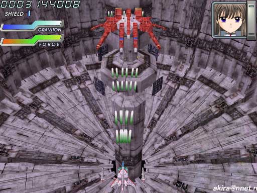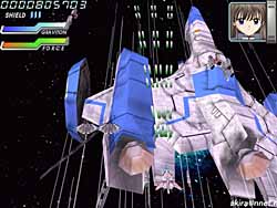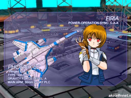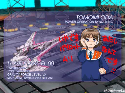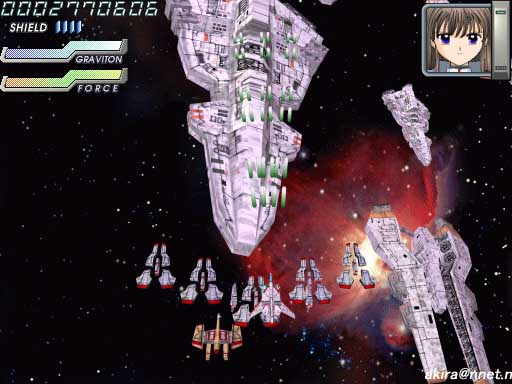基本は縦スクロールシューティングなのですが、オブジェクトが全てDirect3Dで描かれており、それらが巨大なボスキャラ含めて縦横無尽に画面に展開し自機を攻撃してきます。ストーリーはSF仕立てで、プレイヤーは特徴の異なる機体を駆る4人のパイロットのうち一人になり、 地球の存亡をかけて戦います。 パイロット(女の子)は性格がそれぞれあり、シーン毎に声優さんの演技も合わせてストーリを盛り上げてくれます。 で、冒頭のセリフはその中の一人でプレイしていて思わず口にしたものです(笑)。 機体は種類毎に装備が異なり、それぞれが拡散or集中タイプのメインウエポンに後方サブウエポン、サイドサブウエポンを搭載しています。 このシューティングゲーム最大の特徴は、左右のグラビティシールドを前方へ配置することにより敵の弾幕を回避、防御することができる事。 さらに攻撃を防御し続けるとグラビトンゲージが上がり、ゲージが最大になると強力なグラビティレーザーを発射可能で有ることです。 これでボス戦の時などに一気に形勢を逆転する事が可能になっています。 この特徴は各機体によって使い方が変わってきます。 中にはメインウエポンは強力なのにグラビティレーザーを発射するのには時間が掛かる機体や、逆にメインは中程度の威力だが、グラビティレーザーの充填速度はかなり速い機体も有ります。当然バランス型も居ます。 機体毎のシールド再起動までの時間、シールドが持続する時間を頭に入れてプレイしないと、せっかくの装備も使いこなせない事になります。 3Dによる機体デザインもかなり格好良く、キャラデザもなかなかで声優さんも演技もなかなかのものです。 サウンドも申し分なく、MIDIによるBGMもかなり気に入りました。 さらに難易度が低め(コンティニュー無制限?)でエンディングまで簡単に行けます。 エンディングを見て再プレイすると、新キャラが増えたりします。 で、増えたキャラがまた良い味だしています。 ビームはフェイエンしています(笑) ステージ構成も飽きさせない工夫があり、シューティングとしても良い出来なのでは無いでしょうか。 ただドット避けしたいとか言う人には物足りないかもしれませんが(^^; 制作元のサイトでは、なんとOPやEDの歌付きMpegムービーまで公開してます。 ちなみにこのゲームは標準では512x384固定の上に、3Dにフィルタリングがされておらず見た目かなり荒い印象を受けます。 これではせっかくの格好良い機体が見栄え悪いのです。 是非とも此処はVoodoo5やGeForceが搭載しているFSAA(&相当)機能を使用する事をお勧めします。 これで見た目がかなり向上し、美しい3D画面でゲームを楽しむことが出来るようになります。 このゲームをプレイしながら、やはり日本人の造るゲームは趣向が合って良いなと感じました。内容の濃さには外国に負けますが(^^; いずれにせよこのレベルのソフトがネットでフリーというのはもう驚くばかりです。 素晴らしい。 −評価−