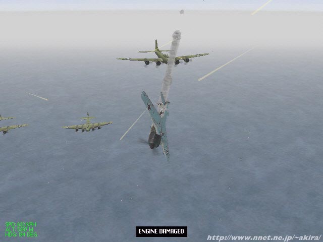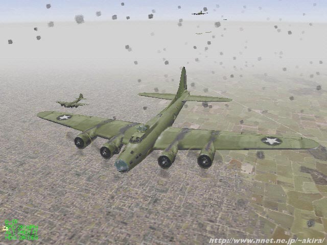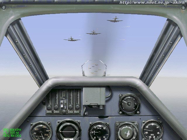 Microproseによる、ソフトウエア、D3D、Glide対応フライトシミュレーションゲーム。 これは第二次世界大戦を舞台とした、空戦シミュレートしたゲームです。 DEMOで使える機体は、North American P-51D Mustangと Focke-Wulf Fw190A-8。 当然どちらもレーダーもミサイルも搭載していない、純然たるレシプロ機です。 このDEMOには時間制限が有り、殆ど飛行感覚とかを掴むくらいしか飛ぶことが出来ません。 敵機と遭遇する時間的猶予がないため肝心のドッグファイトが出来ないのは悲しいですが、大都市の上空を大編隊を組みながら飛行するB-17などを見るだけでも、このソフトの凄さが解るような気がします。 B-17重爆撃機が轟音を立てながら編隊を組み、それを高射砲の砲弾が花火のように弾幕を張り迎え撃つ。 さらに低空から急上昇してきた敵機が蠅のように編隊に群がり、それを爆撃機の銃座が狙い撃つ。 と言うような、まるで昔の戦争映画さながらの映像が目の前で展開されていきます。 地上グラフィックスも非常に緻密で美しいのですが、その状態でなんと何十機もの機体が入り乱れる中でも全くコマ落ちなくスムーズに描画を行っています。 もちろんグラフィックスディテールは最高に設定しています。 まさにサウンド、グラフィックスともに満足できる出来になっています。 私は複雑な操作が必要なフライト物中でも、さらに人間の能力が重視されるレシプロものは大の苦手なのですがそれ以外の人、特にレシプロ機好きの人にはかなりお勧めできる秀作だと思います。 |