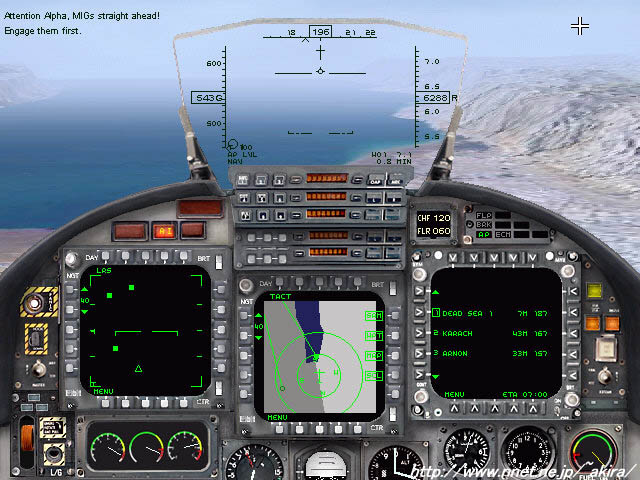 ■ Jane's F-15 DEMO Jane's Combat Simulationsによる、Glide対応F-15シミュレーションゲーム。 このDEMOは、AH-64D LONGBOW並びにLONGBOW 2などで絶大な人気を誇るJane's Simシリーズ最新作であるF-15のDEMOである。 やはりこれまで同様にリアルなシミュレーションよりの作りとなっており、マニア以外には取っつきにくい印象を受ける。 コックピットなどのデザインは実機をかなり模したのになっており、MPDのベゼルスイッチなども全てマウスで押すことにより画面切換やモード選択を行うことができる。 またレーダー周りも実機同様と思われるモードを完備。マニアには堪えられないものとなっている。 フライトモデルに関しては、F22-ADFなどのような最新機種のシムと異なり機動に対するエネルギーの減り方が厳しく、操縦桿を引きっぱなしにすると直ぐに減速してしまう傾向にある。 またエンジンパワーも今時のゲームにしては控えめに(リアルに)設定されており、フル爆装ではなかなか高度を上げることすら難しい。 グラフィックスは最新のGlide対応シムらしく、素晴らしい出来映え。 外部視点での自機グラフィックスは見とれてしまうほどの美しさだ。 地上グラフィックスもなかなか細かく、建物の描写も比較的細かい。 テクスチャーも細かいので、割と地表との距離感は掴みやすい感じだ。 もっとも遠くの地形が近づくにつれ細かく描写されてゆく時に、うねうねとした感じで描画されていくのは少し気味が悪いかもしれない(笑) スピードに関しては私の環境(P55C-206+Voodoo+64MB)では若干遅く、恐らく15fps程で描画されているようである。 もっともこれは最高ディテールの時なので、もっとディテールを落とせば20fps以上は出るだろう。 このシムは初心者にも比較的優しく造られているらしいが、実際に飛んだ感じではやはり中級者以上でないと満足にミッションを達成できないのでは無いかと思われた。 私ももう煩雑な操作が必要なフライトシムには疲れてきているので、昔のストコマのように飛ぶ楽しみ&ストーリー重点のフライト物をそろそろ遊んでみたいものだ。 ちなみにこのDEMO、解凍すると100MBもHDDを使用するので、その点要注意である(笑) |