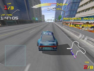 このコースは、高層ビル群に挟まれた片側三車線もの広い道路にスタート地点が有ります。こんなに道幅の広いレースゲームなんて、今まで有っただろうか? うーん、流石U@Rはスケールが違いますね。 エンジンサウンドも相変わらず迫力がありナイスです。 これだけで気分が大分違って来ますからね。 ちなみに製品版にはBGMが有るのですが、これが何と一曲だけなのです。 しかし曲の長さが8分近くあり、ATAPIドライブでリピートしたときの処理落ちを最大限に無くす配慮が見られることも、このU@Rの素晴らしさの現れです。 曲自体もビートの利いたノリの良い内容で、好感が持てます。 出来ればBGMをカットする機能が有れば、なおの事良かったと思いますが。 ナイスなエンジンサウンドが有れば、BGMは要らないと思うのは私だけでは無いはずです。 しかしこれだけビルが建ち並び敵車も含め8台が疾走しているのに、コマ落ちが無く滑らかに画面が流れて行く様は圧巻です。 もうGlide様々ですね(^^; このコースの最初の難関は、第一コーナーをクリアして直ぐに現れる立体交差部分でしょうか。 この辺りで、敵車の渋滞に巻き込まれたりする事も有ります(^^; 狭いスロープを走り、トンネルを抜けた後は海岸線のドライブです。 海上には様々なオブジェクトが浮かび、なかなか良い雰囲気ですね。 次は2番目の難関のヘアピンコーナです。ココをクリアすればまたトンネルに入り、最後の難関ロータリーに突入します。 このロータリーは変則的なレイアウトになっているので、なかなか侵入角度を決めづらいですね。 こんな感じの“West Coast Town”コースです。 別に何も考える必要はないし、コース自体もそれ程面白くはないので何回か走ったら飽きちゃいました(笑) ■“South West Canyon”コース