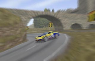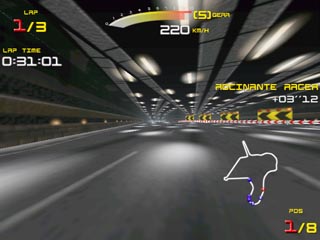 各種メニューはユーザーフレンドリーな作りになっており、好感が持てる。レースゲームには珍しく、解像度が1024*768まで選べるのは驚きだ。 もっともVoodooの場合、Z-Bufferの関係でそんな高解像度までは選べないがPowerVRならば選べるだろう。 各種3D設定も出来るのだが、この時に大凡のfpsが表示されるのは親切だ。 もっともこれがどの程度、信憑性が有るかは解らないが・・・ DEMOだけにコース、モードとも一つしか選べないが、車は“Kalisto Special”と“Team Wildfire”が選べる。 性能的には大差無いようだ。 これで遂にU@R-PROで走ることが出来る。 コース読み込み後、あのDEMOで見たのと同じ様な車と景色が目の前に広がる。 トンネルが目前に有るためか、雨だれの様な音の反響音も聞こえてくる。 そしてあのU@R独特のエンジン音! 甲高いわけでもなく、かと言って低音バリバリの感じでもない心地よいエンジン音が、アクセルと連動して響きわたる。 カウントダウンが終わり、全車一斉にスタート! DAYTONA等からは信じられないようなロケットスタートで車が加速する。 見る見るうちに敵車を追い越してしまい「おりょ?」と思うが、それよりも素晴らしいスピード感と高いフレームレートに驚かされる。 そのうちに最終コーナーに差し掛かり、後輪がスキール音を上げ滑り出した。 しまった! こう言う時、他のレゲーでは直ぐに車体がスピンし、逆ハンは使えないのだが・・・ と思いつつも、クセで逆ハンを切ってしまう。 すると何と言うことか、思った通りにドリフトを修正する事が出来るではないか! ふ、ふ、ふ、そうだ・・・この感じだ! これこそ私がレゲーに求めていた感触なのだ! これはnamcoレゲーをする人なら解るだろう、ドリフトの“快感” これこそが今のPCレゲーに欠如していたものだったのだ。