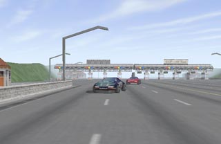 ここは前作U@Rでも、一番特色の有ったコースだった気がします。PROでは、あのブリッジ前からスタート。 霧の中を走り抜けるわけですが、タダの遠景処理の為だけのフォグでは無く、“霧”である事がポイント高いです(^^; ブリッジを走り抜けると、U@Rが最大に他のレースゲームと異なるポイント、“料金所(笑)”に突入します。 はっきり言って、今まで料金所が存在するレースゲームが有っただろうか!?(有る方が不思議なんだって) ちなみに料金を払う必要は有りません(できたら面白いかも) 馴れない内は、高速で料金所に突っ込み玉砕するのですが、馴れれば全く失敗しなくなるというのが不思議なものです・・・ 料金所を過ぎRの大きなコーナーをクリアした後は、今までになく狭い森の中を走り抜けることになります。 ココを一度も壁に当たらずに走れるようになれば、かなりの腕前なのでしょうね・・・ 途中で見られる滝も、道路に溢れた水と音と共に清涼感を醸し出しています。 お次は“West Coast Town”でも見られたトンネルに入るわけですが、ここのトンネルはひと味違います。 なんとトンネル内に320°ターンが有るのです。 いやー、おもしろいっすよ。サイドブレーキを使って、豪快にターンしちゃってください。 ここはタイムより見栄えでコーナーリングすべし!(笑) さてさて、トンネルを過ぎるとこのコースの景観上の特徴である渓谷域に入ります。 見上げるような高さの絶壁や、道路に張り出している岩塊が圧巻です。 途中大きなRのコーナーが有りますが、このRはクイックにも曲がるわけにも行かないし、かといってノンブレーキではアウトに膨らみすぎるので、攻略が難しい所です。 大R中Rとクリアして行くと、最後の難関315°コーナーが待ちかまえています。 しかしコーナー出口が広いため、320°コーナーよりは楽にクリア出来ます。 如何にスピードを落とさずに曲がるかが仮題です。 この辺りで気づいたのは、DEMOでは感じなかったサイドブレーキの重要性。 このコースからは、ハンドリングだけでは曲がりきれないコースが多数出てくるのです。 その為に私はT2のボタンセッティングを変更し、シフトレバーを手前に引くとサイドブレーキ、押すと視点切り替え。 パネルボタンにシフトチェンジを割り当てました。 これだと自然にサイドブレーキを使用することが出来るので便利です。 その代わり、ATしか選べなくなるのは仕方がないことか(^^; ■“Mid-West”コース