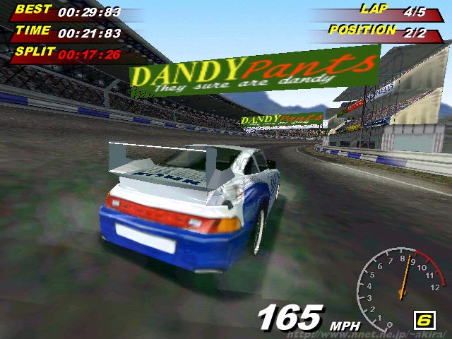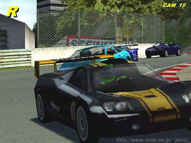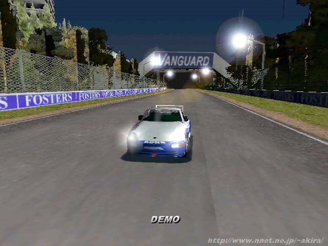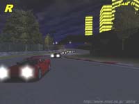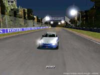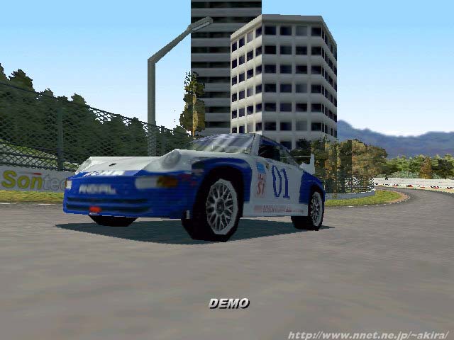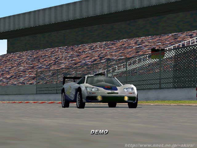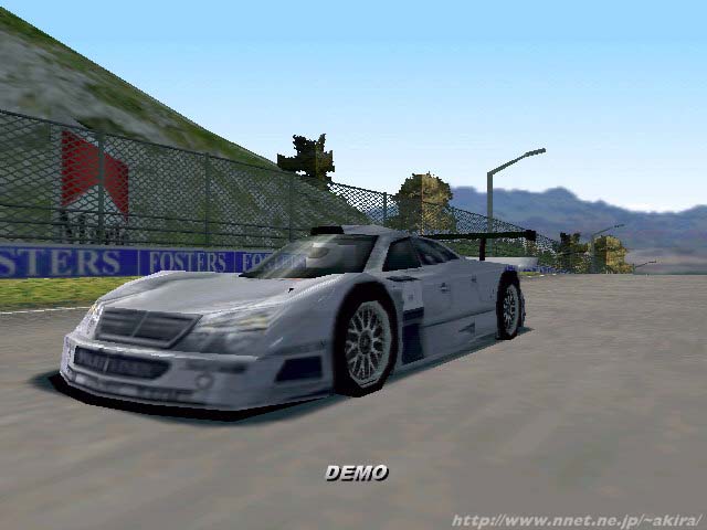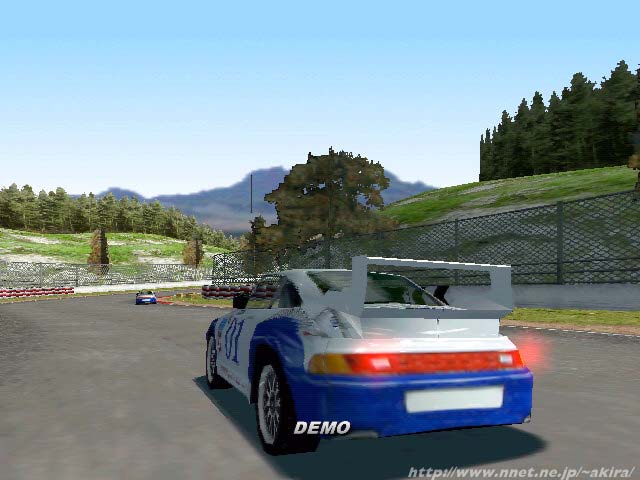 Elite SystemsによるDirect3D対応、3Dレースゲーム。 これはタイトルどおりツーリングカー系のレースゲームDEMOだが、まず特筆すべきは3.5MB以下というこの容量だ。 このサイズとスクリーンショット、Eliteというベンダー名でピンと来た人も多いだろうが、恐らくこれは以前リリースされた“Super Touring DEMO”の改良版だろう。 サイズは相変わらず小さいものの、今度は2コース走れるようになっている。 選択できる車種はポルシェだ(車体データをリネームする事で他の車種も選べる)。 まずトレーニングコースを選択できる。 このコースはコーンを使用したスラロームコースで、これを規定時間内に走りきれば次のサーキットにチャレンジできる仕組になっており、コーンは3つ倒すとアウトの様だ。 もっともポルシェは小回りが利くので、数回練習すれば直ぐトレーニングはクリア出来るだろう。 サーキットではAIカーを最大1台まで含めてレースを行うことが出来る。 周回は最大5周まで設定できる。 サーキットでの走行感覚はなかなか良い感じで、適度に滑りコントロールもし易く感じた。 車体の動きは実際の挙動に近く、URP等のようにドリフト走行をすることはまず不可能。 どちらかと言えばTTCCに近い挙動なのだが、あそこまで滑ると言うことは無い。 PCソフトでは無いので比較対照としてはどうかと思うが、よく言えばグランツーリスモに近いコントロール性を感じた。 もっとも完成度ではグランツーリスモの比では無い。 また、かなり制作者がグランツーリスモを意識しているのではないかという事が、リプレイのカメラアングルなどから感じられた。 タイトルもそれでSuper TouringからGRAND TOURINGに変更したのでは無いだろうか(略せばどちらもグラツー)。 これからも、他のソフトの良い箇所はどんどん取り入れて欲しいものである(思い違いかも知れないが)。 残念ながら今回もデジタル入力にしか対応して無く、ハンドルでのレビューが出来ないのが残念だ。 グラフィックスは“Super Touring DEMO”より更に良くなっている感じだ。 ガラスが半透明で透けているのは勿論のこと、車体のテカリが更に良くなっているようだ。 車体のディテールもなかなか細かく、モデリングも比較的正確に造られている感じがする(セリカはちょっと変だが)。 しかしグラフィックスは良いものの、相変わらずかなり重いのには閉口した。 自分しか走行していない時でも、目測で10〜15fps程しか出ていないように感じた。 さらにサウンド関係も相変わらずの酷い出来だ。 エンジン音もスキール音も再生レートの関係か、かなり情けない音しか出ない。 これらが製品版では改良されていることを望みたい。 他、メニュー画面では走行時の環境を設定でき、昼、夜、雪、雨の環境を選択できる。 他にもカーセッティングでの細かい調整や、大まかにドリフトセッティング、レースセッティング等を選択することも出来き、DEMOなので選択できない項目もまだ有るが、かなり細かにセッティングできることは間違いないようだ。 しかし、相変わらずミラーや視点切り替えをキー一発で出来ないのは疑問だ。 メニュー自体は細かいのだから、せめて視点切り替えだけでもFnキーに割り当てられれば嬉しいのだが・・・ あと、ミラーに必ず自車が映るのは理解できない。制作者の趣味なのだろうか。 −Grand Touring Stuff (demohack) v2.0− NFS3DEMOと同様に、このGT-DEMOでもハックプログラムが公開されている。 内容はトラック変更プログラムと車種変更プログラムで、特にトラックの中には通常では選べない(付属しない)オーバールトラックも選択できるようになっている(そのためDEMO本体より容量が有る)。 車種変更に関しては今まで手動で行ったのを、アイコンをクリックするという簡単な操作だけで好きな車種を選べるようになった。 コースが増えたので再度走ってみたのだが、なぜか動きが滑らかになっていた。目測だが、恐らく20fpsは出ているだろう。 以前は明らかに15fps以下の動きだったので速くなったのは間違いない。 プログラム自体はHachしても変化しないので、恐らく3Dfxの新しいドライバーのお陰だろう。 再度走ったことにより、このGT-DEMOの良い点に気が付いた。 ちょっと表現するのは難しいが、スケール感がリアルなのだ。 実際に正確に再現しているかどうかはともかく、人間の目で感じる感覚としてのリアル感だ。 それでいてスピード感も有る。 この辺りの設定がGT-DEMOでは巧みな感じがする。 逆にスケール感が滅茶苦茶なのはNFSシリーズなので、解る人は直ぐ理解して頂けると思う。 もっともNFS3では設定により幾分良くする事は可能なのだが。 全体としてGTは視点設定関係の操作性が悪いのとサウンドが貧弱なのを除けば、かなりの力作だと言うことが出来るだろう。 ハンドルの対応さえ確かなら、製品版を買おうかとすら思わせる。 希望を言うなら、製品版ではグランツーリスモのように硬派指向ではなく、もう少しテールを楽に流せれられる