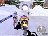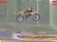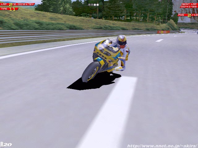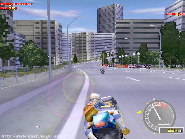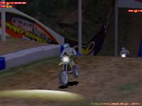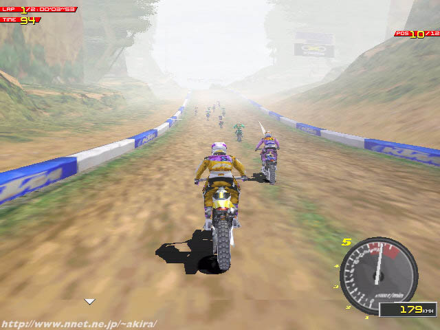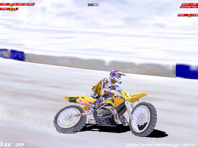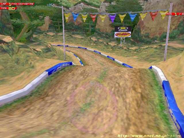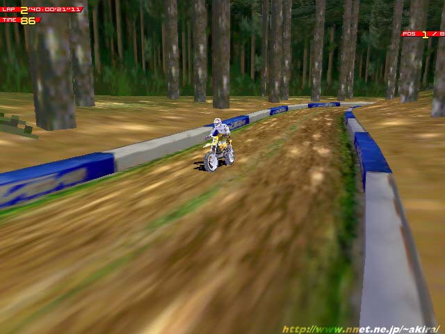 Electronic ArtsによるDD、Direct3D汎用、RIVA128、PVR、Permedia、Voodoo1&2(Glide?)対応、3Dバイクレースゲーム。 大勢のPCゲームファンを虜にしたMotoRacer最新作のDEMOが遂に公開された。 このDEMOでは、オフロード、オンロードを各一コース。さらにマルチプレイ専用コースを一つ含んでおり、それぞれのコースで昼、夜、霧と晴れ、雪の条件を選択出来るようになっている。 コースも前作よりさらに練られている感じで、単調な感じはあまりしない。 バイクのグラフィックスもさらに細かくなり、チェーンのコマまで見えそうな感じがする。 オンロードバイクのカウルがテカっているのもなかなかかっこいい。 簡単な環境マッピングは行っているようだ。 この辺りは右に掲載したスクリーンショットを見て貰った方が速いだろう。 はっきり言って不満は全く無い。 また全体的にポリゴン数が多くなっているのが原因で、前作と比べるとフレームレートはかなり落ちていると感じた。 もっとも前作も初期段階ではせいぜい30fpsかそこらで、パッチが出た後私の環境でも平気で60fpsオーバーとか出していたので、Moto Racer 2でもパッチなどで今後フレームレートが更に上がる可能性は有る。 ちなみに今回の場合、私の環境(P55C-200+Voodoo、640*480)では12台全てのバイクが画面上に有るときには10fps以下。 3,4台が画面内に居るときには15〜20fps。 自分だけの時は20〜40fps。大体全体を通しての平均は25fps程度だろう。 感心したのはフレームレートが15fps前後の時でも、描画自体に引っかかりが無いためストレスを感じることが無いという点だ。最悪10fps程度でも結構不快感は感じない。 しかし残念ながら風景やバイク、ライダーのテクスチャーの質感やポリゴン数は向上したのに、レンズフレアがかなり情けない。 NICE2やF1RS等レンズフレアが非常に美しいソフトが有るというのに、なぜこんなへっぽこな描画なのだろう? はっきり言ってこれなら無い方がマシだ。 視点は追尾が二種類だけのようで、異常に多い視点数を誇った前作から比べるとこれは残念なポイントだ。 使いにくいながらも非常に迫力のあったライダーズ視点は、Moto Racerの売りと勝手に思っていた程だったのだが。 せめて全画面視点は残して欲しかった(もしかしたら出し方が解らないだけかも)。 雪のレースでは実際に雪が舞っているのも新しいポイントだ。 霧の掛かり方も自然で雰囲気が出ている。 オフロードではそれ程感じなかったが、オンロードでは早朝のツーリングと言った感じがし、走っているだけでもなかなか気分が良い。 また新しく夜間走行も選択できるのだが、夜間ならではの美しい夜景を市街地走行で堪能しようと思っていただけに、ただテクスチャーが暗く表示されているだけだったのは非常に興ざめだった。 第一、街灯の明かりすら無いというのは違和感が有りすぎる。 それとも省電力運動推進中のベットタウンでの、真夜中3時のシチュエーションなのだろうか(笑)。 逆にオフロードでは余計な明かりがない方が自然なので、24時間エンデュロー等の夜間走行を彷彿とさせ良い雰囲気になっている。 ゲーム内容を見てみると、これは前作からの大きな変化は無いようだ。 相変わらずのスリリングなターボに、最高のスピード感。 いや、もしかしたらこのスピードに関しては前作以上のものが有るかもしれない。 操作感も相変わらず良好で、PADでの操作も快適だ。 またバイクの挙動がさらにリアルになり、特にオンロードでは後輪が滑り出す感じがよく解るため、前作以上に走るのが面白くなっている。 しかし視点の関係もあるだろうが、オフロードでハイジャンプしたときのゾクゾクするような降下感が無くなった感じがするのは残念だ。 最初に単調な感じはしないと書いたが、DEMOのオフロードコースのデザインはあまり面白くない。 前作のオフロードDEMO(インドア)では、連続するウオッシュボードを上手く乗りこなせたときに凄く爽快感が有ったものだが、今回はそんな感じにはならなかった。 もしかしたら、実際のオフロードライダーはコースデザインに関わっていないのでは無いだろうか。 しかし製品版では32ものトラックが収録されているので、この点に関して気に病む必要は無いのかもしれない。 さらにトラックエディタも付属しているので、気に入らなければいっそ造ってしまえば良いのだ(笑)。 もっともこれがプロの3D-CAD並みに難解な使い心地だったりしたら、付属していても使いようがないので全く意味が無いのだが。 製品版に期待したい。 −Moto Racerシリーズでのフレームレート表示方法− 3Dfxモードの場合は“Moto.exe -3Dfx -MenuClipSpec”これに“ -ijklmnop”というオプションを付け足して起動。 レース開始後Ctrl+F1を押すと画面左側にフレームレートが表示される。 Shift+F1では、グラフィックスインフォメーションが表示できる。 −Moto Racer 2 新バージョンDEMO− Moto Racer 2の新しいDEMOがリリースされた。 新しいDEMOは25MBと、容量が初期のものよりだいぶ