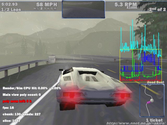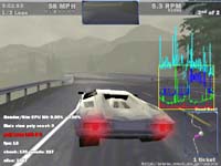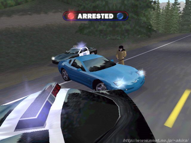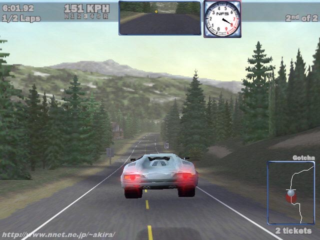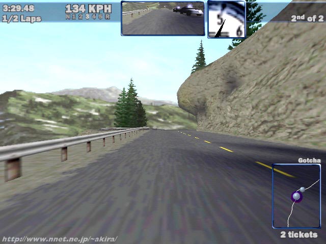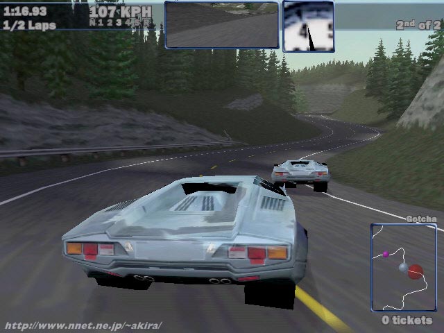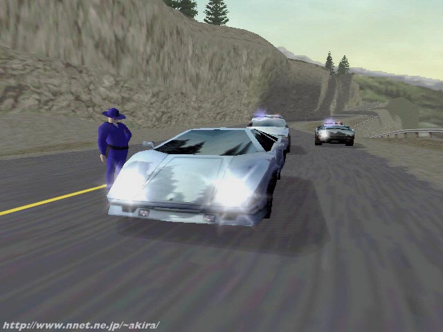 Electronic ArtsによるDD、Direct3D、Voodoo1&2(Glide?)対応、3Dカーレースゲーム。 遂に98年秋に登場するNEED FOR SPEEDシリーズ最新作のDEMOが公開された。 製品版では相変わらず一般庶民には無縁の高級車を操ることが出来る(Lamborghini Diablo、Ferrari 550 Maranello、Mercedes CLK GTR、Corvette C5その他)が、DEMOではその中からランボルギーニ・カウンタックを選択できる(ディアブロの方が好み・・・)。 また今回から第一作目で好評だった対コップ戦を再度繰り広げることができ(笑)、DEMOでもそのモードを楽しむことができる。 DEMOでは警察に3回キップを切られるか、二周するかの何れかまで走ることができる。 このモードでは法規違反走行中パトカーとすれ違うとそのパトカーに追いかけられる仕組みになっており、当然逃げれば追いかけてくる(笑)。 しかもリアルに警察無線まで傍受できるのだが(爆)、どうやら逃げ続けるとパトカーが無線で支援を要請するようで、逃げれば逃げるほどパトカーが複数追いかけてくる。 パトカーにも種類があり、スポーツカータイプのパトカーから逃げるのは流石に辛い。 これらのパトカーが映画さながらにアタックを仕掛けてくる様はかなりの迫力だ。 なんとパトカー二台によるコンビネーション(一台が前方、もう一台がサイドをブロックして壁際に押しつける)で、車体を完全にブロックされることもある。全く持って恐れ入った。 それでも更になんとか逃げ続けていると、なんと前方で待機しているパトカーがポータブルロードブロックを設置しているではないか! これには驚いた。 流石にとっさのことなので避けきれず、無惨にも前輪をバーストさせてしまい敢え無くお縄をちょうだいした(笑)。 さてゲームシステム的には上記の通り、好評だった第一作目に倣っているため結構良い感じに仕上がっている。 オプション類も比較的充実しており、グラフィックスの設定も細かくできる。 グラフィックスはスクリーンショットを見て貰えば解るとおり非常に良い。 全てのディテールを最高にすると、あのグランツーリスモ以上に綺麗になる。 なんと車体にはテカリだけでなく、周りの風景まで映り込むのだ。 流石にこの設定にすると途端に重くなるのだが(それでもまだ軽いのは流石)。 画面表示にワイドとナローを選択できるのも珍しい。 フライト物(EF2000やF22ADF)にはこのオプションを見ることが有ったが、まさかレースゲームにも使えるとは。 しかもこれは結構効果的で、NFSシリーズの欠点だったミニチュアっぽい画面をワイドでは改善する事ができる。 さらにミラーやマップ、スピードメーターやタコメーターなどの表示類に関する設定ができるのも非常に良い。 これが無いゲームは結構多く、細かい点だが流石こなれてきているシリーズだと実感した。 しかし何時もレースゲームレビューで言っているが、肝心なのは走行感だ。 ・・・・残念ながらこの点でNEED FOR SPEED IIIは、これまでのシリーズの中で最悪と言っても過言ではない。 まず接地感がシリーズ最悪に“無い”。見事に“無い”。 さらにコントロールにキーボードを使う時、二つのキーを同時に押すと一瞬全ての入力が効かなくなるバグが有る(Readmeにも記述が有る。デジタルパッド使用時の場合は定かではない)。 またハンドルコントローラーでは、センシティビティーの設定がないためも有るのだが、かなり“曲がらない”。 それとも、曲がらないのはカウンタックの“仕様”なのか? はっきり言ってコントロール性は最悪に等しい。 サイドブレーキは有るのでこれでコーナーリングの悪さを補えるのだがこれが余りにも情けなく、慣性を全く無視した動きなのは残念だ。 コースデザインも単調で、もしコップモードが無ければ全く走るのさえ面白く感じないだろう。 もっともこれはDEMOのコースだけの問題かも知れないが(例えばMH_DEMOのコースも面白く無かったが、実際のMHではかなり面白いコースが多かった)。 何れにせよ製品版が出るのはまだ先のことなので、このDEMOが製品版の評価を決めるものとはならない。 しかしNFSは今まで、DEMOと製品版とで走行感が変わったことは無いのだが・・・ 早くも2nd Impression ハンドル、キーボードとも最悪の操作感のこのゲーム。 しかしデジタルパッドでのインプレッションもしなければ公平では無いか?と思い、面倒だが切り替えて遊んでみた。 結果は・・・・ お、面白い! これはイケてる!(笑) ハンドルやキーボードだと、一位になるどころか直ぐにパトに捕まってしまいゲームオーバーになるところ、なんと一発で一位! しかも二度もロードブロックを回避できた。 デジタルな操作感で不快だったサイドブレーキも、パッドででなら快適。全く違和感無く簡単にサイドを使いながらコーナーリング可能。 まさかこれ程まで変わるとは・・・ さらに一位になって解ったことは、なんとライバルもスピード違反で捕まってしまうと言うこと。そーなのか・・・これは面白い。 捕まったライバルを片目に悠