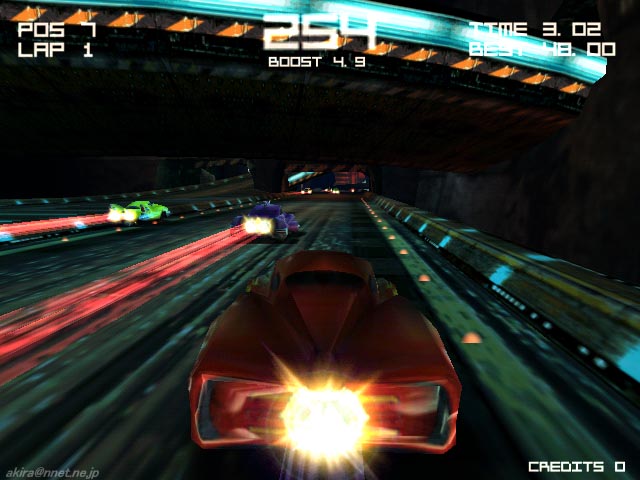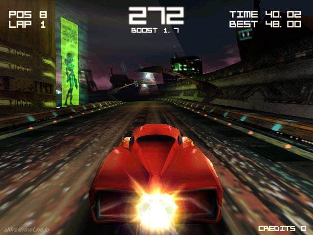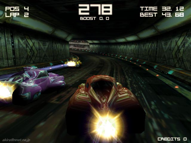 このゲームはChurch Electronic Entertainmentによる、近未来3Dレースゲーム。Direct3D対応。 このゲームは近未来的な都市に設置された首都高的夜景の美しいコースを、57年代の様なクラッシックな外観をしたエアカー(?)で爆走するというものである(笑)。 DEMOで選べるコースと車種は一つのみ(一見他の車種も選べそうなのだが・・・)。 ゲーム内容としてはDethkarz、Powerslide、PODが近いと思われるが、確かに景色の美しさでDethkarzに、ドリフト感覚はPowerslideに、そして走行感覚はPODに似ている。 しかし、Dethkarzの様に敵車を攻撃する手段は備わって無く、Powerslideの様なまでなズリズリ感の有るドリフトでは無い。 このMars Maniacsは、思った通りにコーナーリングでカウンターをあてる事が出来、気持ちが良い。 またあっと言う間に無くなるもののブースター機能があり、なかなかのスピード感がある。 コースレイアウトもDethkarzの様に高架的コースなのだが、流石にこのゲームではコースアウトする心配は無いようだ(笑)。 この点では走った感じWipeOutXLに、やや似ているとも感じられた。 しかし近未来的レースゲームでは常套となった、敵車攻撃アイテムが無いのはマルチプレイ時に寂しいかもしれないが、有れば有ったで走りに集中出来なくなるので、それは別に構わないだろう。 さてこれが無いと私のそのDEMOに対する評価が大いに下がるポイントとして、OPTION項目が有るか無いかというのが有るが、このDEMOではぎりぎりグラフィックスとサウンドの設定は行えるようだ。 私がプレイした時にはグラフィックス設定が最高の60fps設定になっていたので一応そのままでプレイしたのだが、実際に30fpsとは見た目でかなり違い、非常に滑らかにゲームが動いたのには驚いた。 グラフィックス自体も非常に細やかで美しく、車体の反射光や前方の闇夜に光り輝き長い尾を引く敵車のバーナーなど、見るべき点は多い。 この滑らかさとコーナーリングの心地よさ、そしてDethkarzにも劣らない(それ以上?)、周囲の景色の格好良さで、一見大した事が無いDEMOにも見えるが、星4つをあげたいと思う。 しかしキー操作が左右、アクセル、ブーストの4つしかないのは如何にもコンシュマー的造りのように思える。 あまりにも最近のゲームの中では簡易すぎて、思わず幼少の頃遊んだ2ボタンしかないリモコンカーを思い出してしまった(笑)。 まあ簡易なのは良いとしても、Readmeまで簡易にするのはどうかと思うが・・・ しかしより詳しいReadmeとアナログ、デジタル、キーアサイン程度を備えたコントロール設定。 そしてせっかくの美しいコーナーリングを後ほど堪能するためのリプレイ機能(DEMOでも有った方がよい)。 さらに全面と後方追尾だけの2視点だけでは無く、もっと豊富な視点切り替えが有れば(多すぎるのは困るが)、評価がさらに星半分はアップする事だろう。 もっとも、当方の評価に星半分というのは存在しないのだが。 −2nd Impression− 上記のレビューをアップして数時間後に2ndを書くのはどうかと思ったが、上の文は修正せずに新たにレビューを書き加えたいと思う。 さて、このままHDDから消去しようかと思っていた本DEMOであるが、この綺麗なグラフィックスをもう一度見るのも悪くはないだろうと思い、再度プレイしてみた。 結果・・・・しばらくはまってしまった(笑)。 まず気が付いたのは、最初はてっきり3周がリミットだと思っていたのが、実はTIME EXTENTION制で速く周回すればする程、何周も走れると言う事だ。 これに気が付いてからは、さらにブースト機能が周回ごとに幾分回復する事に気が付いてからは、一体何周回れるのかと熱がついつい入ってしまった。 取りあえずしばらく走ったところでは、なんとか14周までは行けた。 14周目ともなると周回遅れが出始めるので、これ以上はさらなる熟練を要する感じだ。 しかしどうも周回を重ねれば重ねるほど、スピード感が増しているように感じる。 まるで周回すればするほど敵が強くなる、某シューティングゲーの様だ(笑)。 (一周目では280km/hそこそこがMAXなのだが、14周目ともなると軽く500km/hを越えるようになるのでそう感じる) 結果として10周目を越える辺りから目も回るほどの勢いで走ることになり、自車を操るキー操作に指が付いてこなくなる程だった(笑)。 最近はあまりゲームをしていないので、目も指もなまってしまったのだろう。 ゲーム以外にも気が付いた点が有る。 上で言っていた60fps固定モードだが、どうやらこれを選ぶと他の項目をどんなに高くしても、そのマシンで60fps出るように、勝手に設定を変えてしまうようだ。 これは1024*768で60fps固定モードにした時に、路面がフィルタリングされなくなったので気が付いた点だ。 もっともfps解除モードにすると、設定した画質で出る最高のfpsが表示される事になる。 流石に1024*768で60fpsは無理だったようだ(800*600はOK)。 しかしこのゲーム、WipeOutXLやPODで不満だった自車とコースのスケール感に関する違和感が全くなく、全画