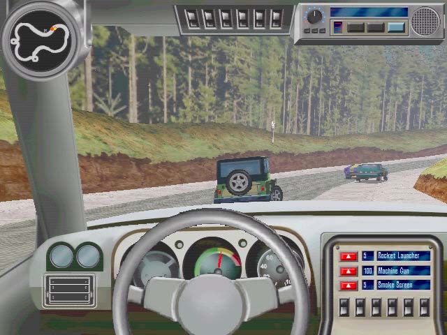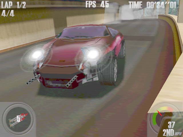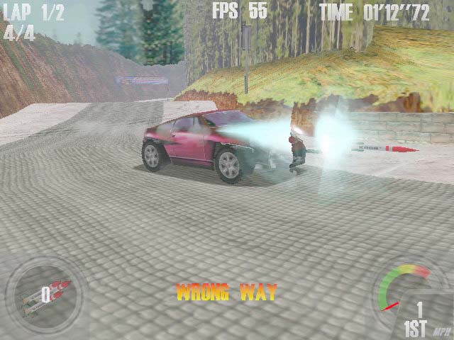 このゲームはIntense Entertainment Interactiveによる、3Dコンバットカーレーシングゲーム。Direct3D/3DNOW!対応。 このゲーム、コンバットレースと銘打っているように、DethkarzやWipeoutシリーズのように敵車を攻撃しながらレースを進めるタイプのゲームだ。 しかしこの手のゲームには珍しく舞台は近代となっており、登場する車も結構見慣れた感じのものが多い。 DEMOではゲームモードがシングルレース、使用できるキャラクターはBUD THE CRUD、コースはMOUNTAIN RUNのみ、これを計4台で競うレースを楽しむ事が出来る。 このゲームでも他のレースものに有るようなガレージが有るのだが、他のゲームがここでは車の設定を行うのに対し、このゲームではTIRES、DRIVE TRAIN、WEAPONS、ARMOR、REPAIR、MISC、PAINTの各設定を行うことが出来るのがコンバットレース的特徴である。 メニュー関係では他にグラフィックスやサウンド、コントローラーに関する設定が有るが、3DNOW!の設定やTripreBufferingの設定が出来たり、ハンドル、キーボード両方の設定が当時に生かせたりそれらの設定が保存できたりと、特に不満は無い作りなのは良い。 DEMOながらBGMもレース中流れている。 レースもので定番の視点切り替えはドライバーズ視点、ボンネット視点、追尾視点x3、後方視点、TV視点など充実している。 さらにFPS表示も出来る優れものだ。 さてDEMOとして今まで挙げたポイントを考慮すると結構良い線を行っているように思える。 しかし肝心の走行感覚等に関してはどうだろうか。 まず真っ先にこのDEMOをプレイした人が思うのは、「最高にコントロールし難い!」という事だろう。 とにかく真っ直ぐに走ることが難しいのだ。 これは有る程度コントロール設定で何とか出来るのだが、それでも劣悪な操作感覚には代わりがない。 このゲームをプレイすると、N.I.C.E. 2や NEED FOR SPEED IIIすら、とても素晴らしい操作感覚のゲームに見えてくる程だ(笑)。 さらにこのゲームが売りのコンバット装備が、実際には全く役に立たないのも情けない。 真っ直ぐ走るのも難しいのに、どうやって敵車に攻撃を当てれば良いというのだ。 大体攻撃を受けて車体が破損されるより、壁にぶつかりまくって車体が破損し走行不能になる事の方が断然多いのだ。 コース自体もコーナーが多く、スピード感にも乏しいし、さらに陳腐なグラフィックスの割りにそんなに描画が軽いわけでも無い。 本来こんなゲーム、レビューすら書きたくないのだが、このDEMOに先だってプレイしたJeff Gordon XS Racingがこれより酷いDEMOだったので、結局このDEMOをレビューする事となった。 まったくどちらともHDDのゴミにしかなり得ないDEMOであると言える。 |