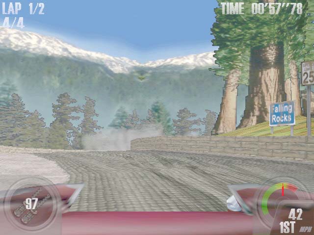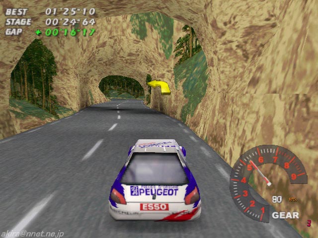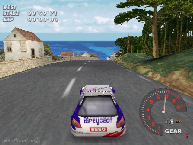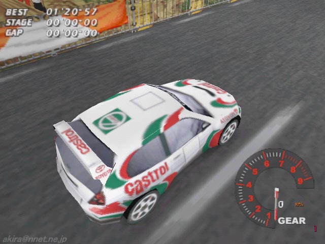 このゲームはInfogramesによる、3Dラリーレースゲーム。Glide/Direct3D対応。 DEMOで選べるコースはCORSICA(ターマック)のみ、その代わりDEMOにしては珍しく、SUBARU IMPREZA WRC、MITSUBISHI LANCER、TOYOTA COROLLA WRC、FORD ESCORT WRC、PEUGEOT 306 MAXI、RENAULT MAXI MEGANE FR、NISSAN ALMERA KITCAR、SEAT IBIZA KITCAR EV2、CITROEN SAXO KITCAR、SKODA FELICIA KITCAR、PEUGEOT 106 MAXIの、計11ものOfficial World Rally Championship Carsを選択できる様になっている。これは製品版と変わらない。 また各車とも迫力は無いまでも、エンジン音を微妙に異ならせている点は評価できる。 このDEMOでは一見CORSICA以外にINDONESIAやSPAINを選択できるように見えるのだが、実際にはCORSICA以外走れないようだ。残念。 ちなみに製品版では、40もの各国のコースが含まれている。 オプション類はコントロール、サウンド等比較的充実している部類だが、グラフィックス設定が弱いようだ。 せめて各表示オプションや、解像度の設定位は備えて貰いたいものだ。 車自体の設定もギアボックスやサスペンション等、簡単ながらも行える。 レース中選択できる視点は全画面視点、ボンネット視点、後方追尾x4の計6つ。 まず不足は感じないが、ドライバー視点が無いのは評価が分かれるポイントだろう。 ボンネット視点が有るので、私はそれ程問題には感じなかった。 グラフィックスに関しては殆ど設定が無いに等しいが、実際に表示されるのを見るとなかなかのもので、まずIRCレベルは行っている感じである。 レンズフレアも結構綺麗だし、動作速度もGlide/Direct3D共申し分ない。 スピード感も、ラリーレースものの中ではかなり有る方だろう。 さて、褒めるのはこれ位にしておこう。 このゲームでまず驚くのは、そのラリーゲーム中最悪とも言える車体モデリング&カラーリング(まともなのはカローラ位?)だろう。 今まで最悪だと思っていたIRCすら下回る様には、かなり呆れてしまった。 実際に操作した時にも車重や路面抵抗の感覚が無きに等しく、しかもハンドル入力に対しクイックに反応し殆ど直角に曲がってしまうという、あまりにも怪しい挙動。 さらに路肩に乗り上げると直ぐに転がりスピンしまくるため、お陰でしばらくプレイすると気分が悪くなる状況に陥った。 コース設計も単調で、走る気力を無くしてしまうのに十分なレイアウトだと言える。 コンシューマ用に販売されていた時からダメゲーの烙印を押されていた当ゲームだが、PCに移植されてもダメさは直っていなかったようだ。 本当は更に言いたいことが有るのだが、このゲームにはそれに労力を裂くのももったいなく感じる。 買うだけ(遊ぶだけ)無駄だと言えるだろう。 |