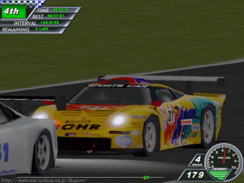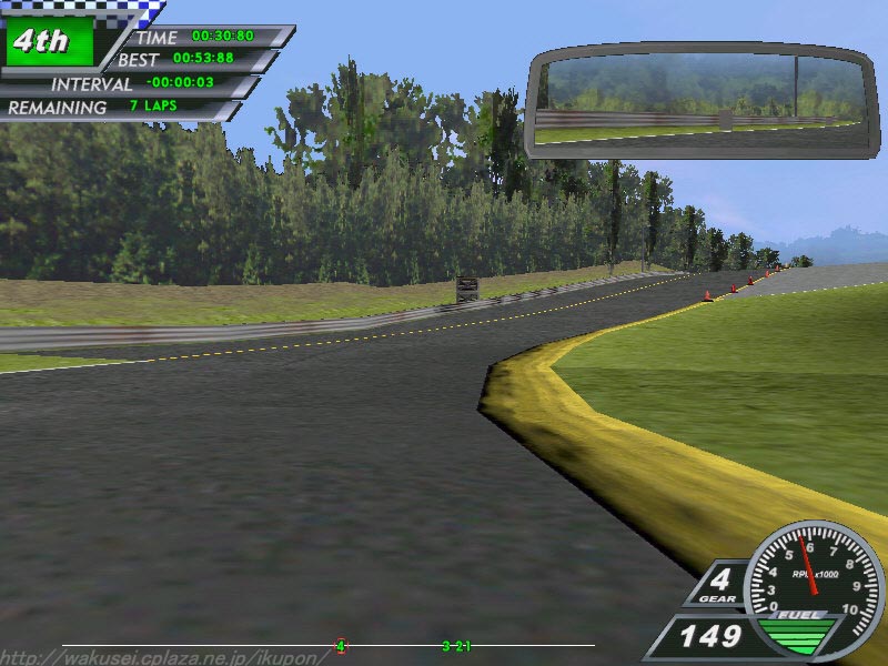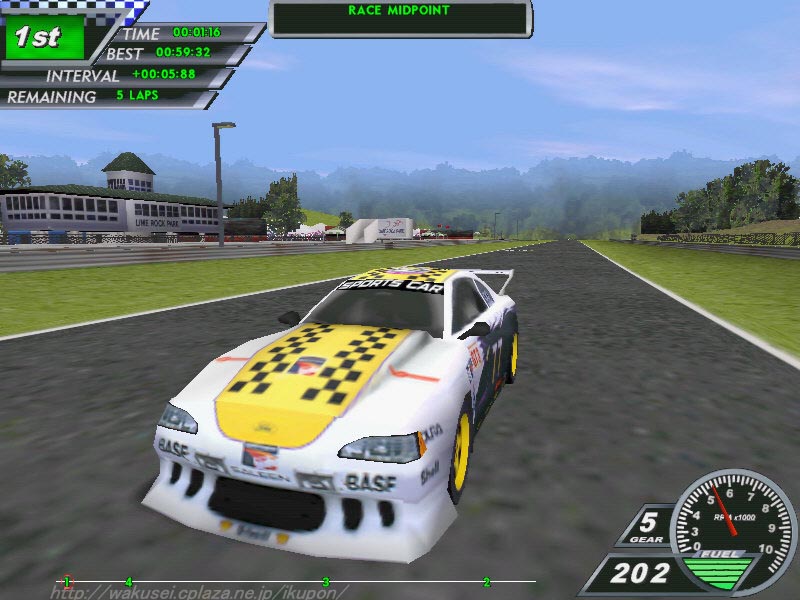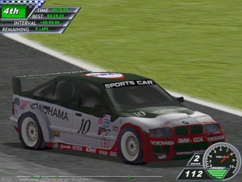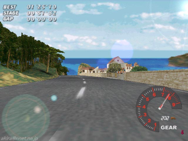 このゲームはElectronic Artsによる、3Dレースシミュレーション。Glide/Direct3D/FFB対応。 DEMOで選べるコースはLime Rockのみ、天候は変更できないが夜間コースを走ることが出来る。 車両はPanoz GTR-1、BMW M3、 Beginners Car (ポルシェ?)の3台を選択可能。ちなみに製品版では実在する45種もの車両が登場する。 レース中選択できる視点は全画面視点、自在カメラ(笑)、TVカメラの計3つ。 基本的視点は3つながら、カメラの位置を自在に変更できるという特徴のお陰で、特に不満を感じる事は無い。ルームミラーも装備している。 ドライバーズ視点が無い事が評価を下げてしまうポイントになるかもしれないが、個人的にはそれ程問題にはならないと思っている。 もっともドライバーズ視点は当然有ればそれに越したことは無いのだが、このゲーム自体が45種もの車両を扱っている故に、それぞれの車種毎に内装グラフィックスを用意しなければならない手間を考えると、これくらいの妥協は許せるだろう。 他にもDEMOながら、グラフィックス、コントロールオプション設定類やカーセッティング等のメニューは全て機能しており好感が持てる。 自分の思った設定ができずイライラさせられるDEMOが多い中で、これは評価を高めて良いポイントだ。 さらにリプレイ機能(保存可能)やステアリング、ブレーキサポート機能も搭載しており、正に至れり尽くせりの造りとなっている。 実際の走行画面に目を移してみると、車体モデリングは今まで見てきたレースゲームの中でも一番と言って良いほど凝っており、車体の細かな凹凸やリアウイングまで立体的に再生されている。 車体テクスチャーも非常に細かく、スポンサー名もはっきり解るほどだが、最近流行の半透明処理で車内を見させるというテクニックは使われていない。その為に、如何にもテクスチャーで車体を覆っています的な外観になっているのは残念。 コースや周囲のオブジェクトの作り込みは結構丁寧で、TOCA2並かそれ以上に感じらる。 絵画的なグラフィックスのTOCA2に対して、このゲームはより実写的な風景を再現している。 実際に走行してみると、TOCA2の様なリアルな走行感で、難易度はTOCA2より下げた感じを受けた。 最近プレイしたレースゲームは、殆ど接地感など無視したホバーカー的動きで走る気すら起きないものだったが、このゲームはグリップし過ぎる訳でもなく、かといって常にタイアが滑っているという感じでもなく、走っていて理不尽な感じのしない自然な挙動だと感じる事ができた。 確かにTOCAのスピンし易い特性が実際に基づいているとしても、やはり素人からすればこちらの方がより自然な挙動に感じられてしまう。 また車種毎にコーナーリング性能などのコントロール特性が異なるのを再現しているのも、なかなか優れたポイントだと思う。 さらにアスファルトやサンドトラップなど、路面によってグリップの度合いがはっきり解るのも、TOCAに似て良いポイントだ。 エンジン音もなかなかにリアルで良いのだが、ロードノイズがエンジン音を上回って再生されているのには違和感を感じる。 走行中の正確なフレームレートは解らないが、目測で30fpsは確実に越えているようだし(800x600、Glide、P2-266)、レースでのスピード感も申し分なく、このDEMOをプレイした限り文句のないゲームであると言うことができるだろう(追加:ルームミラーを表示するとフレームレートが結構落ち込むようだ)。 |