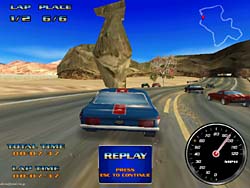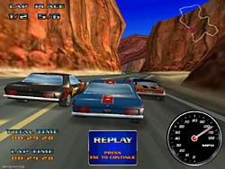 ★☆☆☆☆| Fiendish Gamesによる、3Dレースゲーム。Direct3D対応。 このゲームでは、70年代のクラッシックなアメ車を駆り、Desert系コースのARIZONA HIGHWAYと、Mountain系コースのALPINE PASSをそれぞれ2週走る事ができる。 ゲームモードはTIME TRIALとCHAMPIONSHIPの2つ、選択できる車種は“おてんば娘”DaisyのCAMERO V8と、“大人のお色気”SharonのG2 ROADSTERだ(そうなのか?)。 オプション類はグラフィックスとサウンドのみ。 設定できる項目は、無いよりマシと言った程度。 コントロールはキーボードのみで、しかも何時も止めて欲しいと思っている、カーソルの上下がアクセルとブレーキにアサインされているタイプだ。 車種により操作性が(幾分)異なり、個人的にはCAMERO V8の方が扱いやすく感じた。 しかし基本的にこのゲームに、シミュレーション性や爽快なアーケード性を求めてはいけない。 では、何を求めるのか? それは広大なアメリカの大地を、ぶつかれば一斗缶が潰れるような音を出す扱い難いアメ車を駆り、障害物に当たっては物理法則を無視して跳ね返り、普通には曲がれないコーナーでもサイドブレーキを豪快に掛けてクリアし、アメリカン美女のDaisyやSharonと戯れる・・・そういうゲームなのだ(マジですか?)。 グラフィックスはまずまず綺麗だ・・・と思う。 最近のDirect3Dを使用しているソフトの中で、中の上くらいは行っているだろう。 特に背景がなかなかに綺麗で好感が持てる。 描画スピードも不満は無い。 視点も追尾x3の全画面が1つで不足は無い・・・と一見思えるが、何れの視点でも視界が今一悪く、存在意義が解らない視点まで有るのが困りものだ。 せめてドライバーズ視点は用意して欲しい。 コースレイアウトはトンネル有りの、ジャンプポイント有りのでまずまずの完成度・・・とは言い難い。 なぜならSCREAMERシリーズやN.I.C.E. 2の方が遙かにマシだと思えるからだ。 とにかく何度も視界不良になる箇所が有り、危険極まりない(笑)。 もっともMotorheadの様に途中で簡単な分岐が有ったりして、少しは工夫をしている様子がうかがえる・・・かも。 リプレイが有るゲームは一般に評価を高くするのだが、このゲームのリプレイは視点がTVカム風に変わる訳でも無く、存在意義を疑ってしまった。つまらん。 車の挙動に関しては、これ以上何も言いたくない(爆)。 Driverの爪の垢を煎じて静脈注射するしかないでしょう。 とにかく、この最高の挙動をDEMOをダウンロードして味わう事をお勧めする。 このゲームはアメリカン命な貴方にZEHI! |         |