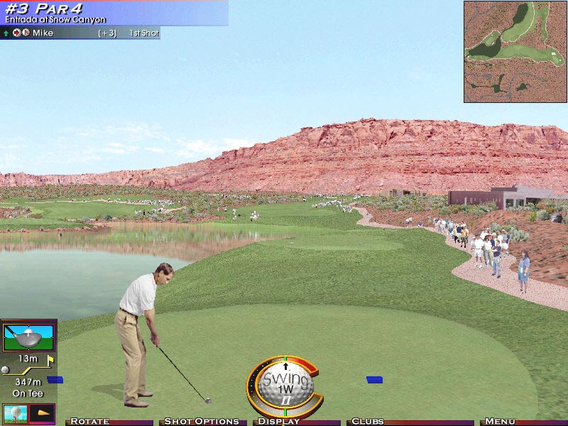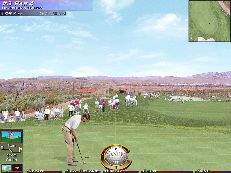 Incredible Technologiesによる、ゴルフシミュレーション。DEMOでは3ホールまで遊べ、4人までの同時プレイが可能になっている(製品版ではネットワーク対戦も可能)。 一人で遊ぶ場合でも、シャドウプレーヤーとして数人が登録されているので、彼らとのプレイを楽しむことが出来るし、自分のプレイをシャドウに登録する事も可能で、レースゲーで言うゴーストカーモードに相当する機能も備わっている。 ゴルフゲームとしては、LINKS系などのシムよりPGA TOUR GOLF系などのアーケード寄りの造りになっており、EASYに設定すれば、殆どただスイングするだけでパーフェクトなプレイをする事が出来る。 スイングのコントロール方法については各ゴルフゲーム色々趣向を凝らしているが、Golden Tee Golfの場合には大凡のスイング方向を決めた後は、全てマウスのスイング次第でコントロールするようになっている。 そのため複雑なメニュー形態が必要無く、ゲーム画面も非常にすっきりした感じに仕上がっているので初めての人でも取っつきやすいソフトとなっている。 オプション画面でマウス感度や難易度、グラフィックス設定を行え、640*480から1024*768の解像度を選択出来き、フォグの掛かり具合も変更可能になっている。 私のマシンでは、流石に1024*768では若干のもたつきが感じられた。 しかし風景などの描画は何れの解像度でも一瞬で終了し、486マシンでLINKS386PROをプレイしていた頃が少し懐かしく感じた。 他にもこのオプションでは、サブウインドウに表示されるショット後のゴルフボールに関する視点を色々変更できる。 中でも興味深かったのは「遙かなるオーガスタ」で好評だった、ゴルフボール視点が有ったことだろう。 もっともこのゲーム自体がDirectDRAWだけで描画しているので、この視点は流石に重く感じられた。 ゲーム中聞こえる環境音やギャラリーのざわめきなども賑やかで、ゲームを盛り上げるのに一役買っているだろう。 全体としてGolden Tee Golfは、グラフィックス、サウンド、スピード、操作性とも好感の持てる仕上がりになっており、特に目立ったフューチャーは無いものの、ゴルフ好きなら万人に進めることが出来るゲームだと言うことが出来る。 欲を言っても、Direct3Dに対応して欲しかったと言う点くらいだろう。 |