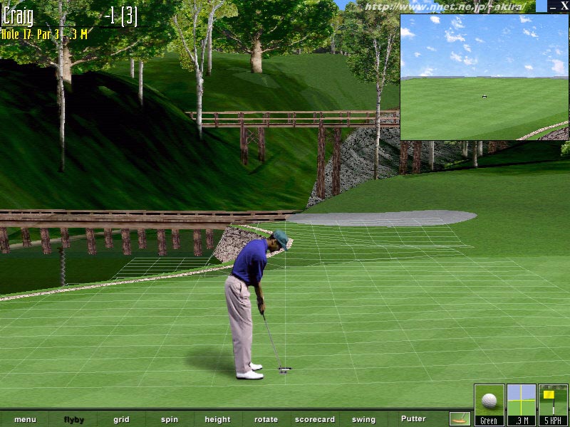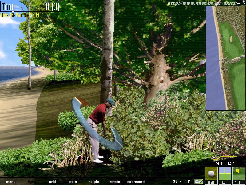 Microsoftによる、Direct3D対応ゴルフシミュレーション。 元祖はLinks386ProのWindows版の様なソフトで、グラフィックスも結構チープなゲームだったが、この最新版では最高級のグラフィックスを堪能することが出来るようになっている。 しかもゴルフゲームではおそらく初のDirect3D対応で、DEMO版では800x600のレゾリューションでプレイする事ができる。 もっとも木などのオブジェクトグラフィックスは相変わらず2Dなのだが、他のゴルフゲームと違いそれらが近景で大きく描画されても非常に美しいのが特徴だろう。 恐らく元々のグラフィックスが大きく、遠景では縮小しているのだろう、グラフィックスの描画に若干もたつきが有るのは気になるポイントだ。 スイング方法が色々選択できるようだが、昔ながらの伝統的なLinks方式が選択できるのは嬉しいポイントだ。 DEMOでは「Bay Harbor」を3ホールプレイ可能。天候設定などもでき、霧の中でのプレイも堪能できる。 グラフィックスに関しては満足だが、他のソフトと違い環境音の類が少し寂しく感じられた。 ギャラリーや鳥のさえずりなど、これらはもう少し賑やかな方がやる気が増すような気がするのだが。 DEMOなのに、製品版のCDを入れるようにとメッセージが出るのも興ざめだ。 またグラフィックス関係など、一部に少々のバグが見られた。 製品版での改善を期待したい。 |
