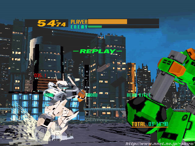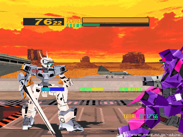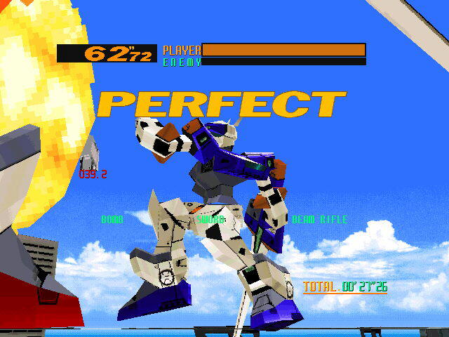 これはSEGAゲーで良くあるSSからの移植ではなく、初のアーケードからの移植作品である。これまでのSSからの移植作品は、私から見ればクソゲーであった(評価はするが)。 元のゲーム自体は良いのだが大抵SSからのベタ移植で、PCをなめているとしか思えない出来だった。 しかしこのV.Oは違う。 個人的に言わせてもらえば、現在プレイ出来るアーケード版、SS版を越え最高の出来だと評価しよう。 そう、アーケード版を越えているのである。 しかもプレイしたマシンは、CPUがP55C-206、64MBのEDORAM、ビデオがViRGEという決してベストは言えない環境に於いてでもある。 このマシンでもSVGAで、オブジェクト設定を下げることで快適にプレイできる。 気にしていたスワップによる動作遅延だが、殆ど気になることがない。 逆にアーケード版の方が、場面により激しく処理落ちしているのを感じるほどだ。 V.Oが快適にプレイできないと言う人の殆どが、メモリーが足りないかビデオカード能力が低いようだ。 メモリーは最低64MB、そしてDDBENCHで100以上出るカードは必須だろう。 V.OはMMXを使用しているがD3Dなどは使用していないので、DirectDrawの性能が重要なのである。 ちなみに私がアーケード版をあまり評価していないのは、あのツインスティックに私がシンクロ出来なかったからだ。 だからツインスティックを使い慣れている人で有れば、当然評価が違ってくるだろう。 SS版も購入したが解像度が荒く、今一のめり込めなかったのである。 操作感についてだが、PC版では最初キーボードで操作していた。 しかしこれだと練習ステージまでしかクリアできなかった。 そこでV.OだけのためにSideWinderPADを購入。すると瞬く間にラスボスもクリアできてしまった(EASYモード)。 個人的にPADは好みではないのだが、V.Oに関してはこのMS製のPADをお勧めしたい。 私はV.OのVRの中ではTEMJINが一番好みだ。 ビームソードを使用するTEMJINには痺れてしまう。あのカトキデザインは最高だ。 しかし実際に使えたのは、一番ダサイと思っていたBAL-BAS-BOWだった(笑) V.Oに関しては上級ステージに行くほど、TEMJINのビームソード等の接近戦タイプの武器が使えないのだ。 それよりも、高い誘導性能を誇るBAL-BAS-BOWのフローティング・マイン等の方が使いやすいのである。 もっとも極めた人は、テムジン&HARDレベルでラスボスに勝てるそうなので、私の腕はまだまだ未熟なのだ。 またVRの移動性能も重要のようだ。 移動速度の遅いVRでは、たちどころにBELGDORのホーミングミサイルや、BAL-BAS-BOWのフローティング・マイン、ラスボスの超強力ビームキャノンの前に散ってしまうだろう。 たしかにRAIDENの高出力レーザーも魅力なのだが、当たらなければ意味がないし、あの鈍足では後半は苦労すること必至である。 ところで次期V.Oがそろそろアーケードでお目見えするようだが、スクリーンショットを見た限りではとても現存のPCではまともに動かせるようなモノではなかった。 もっとも次期V.OがPCに移植される頃にはMMX2やPentium2-400MHz、Voodoo2二枚差し&AGPx2なんていう環境が普通になっているかもしれませんね(^^; −メインメモリー128MBレビュー− 64MBから128MBにメモリーを増設しただけで、動作等が改善されたゲームソフトと言うのはまだそんなに見あたりません。 MotorHeadのムービーのコマ落ちが無くなったとかそれくらいでしょうか(^^; しかし、もしかしてと思い再インストールしたV.ONですが・・・ や、やはり64MB時より動作が改善されました! Fastモード、スクリーンサイズ:ラージ、フィールドオブジェクト:ノーマル、の設定にしてみたのですが、以前もそんなにコマ落ちは感じられなかったのですが、 128MBの今回は、まるでCPUのクロックがワンランクアップした程の速度向上を感じました。 この速度向上は、P55C-200(66*3)→225(75*3)にした時よりも大きいです。 特にヴァーチャロイドの発進シーンでは、以前に比較しほぼ完全にスムーズな再生を行っています。 以前は特に水しぶきが上がるシーンで少しコマ落ちが感じられたのですが、今回は全くコマ落ちが感じられません。 とにかく全ての動作がスムーズに感じます。 余りにも感激したので、今度は試しにSmoothモードに設定してみました(^^; 流石に動作が若干遅く感じられるようになりましたが、スクリーンサイズをノーマルに落とすと、やはり滑らかに動作するようになりました。 V.ONに関しては、128MBでなくとも96MB位から滑らかさが増すそうなので、32MBや64MBでV.ONをプレイしてなんか引っかかるなと思った方は、メインメモリーを増設する事をお勧めします。 これならアーケードより快適です(^^; −メインメモリー128MBレビュー2nd− 今回は更に詳細な結果を記します。 テストにはDebug*モードを使用しました。 グラフィックス設定は、Screen:Large,FieldGraphic:Normal,DisplayObject:SkyOnly,Texture:All。 この設定でヴァーチャロイド選択画面にて、Motion:Fast(20fps)を選択した場合に20fps。 Motion:Smooth(30fps)を選択した場合、21fps。 この状態でScreen:Nor