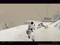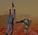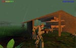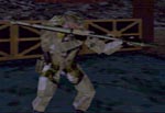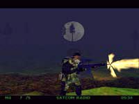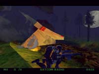 Zombieからリリースの、陸軍特殊部隊シミュレーター(DEMOはGLIDE専用なのでVoodoo系カード必須)。 特殊部隊等をモチーフとしたゲームは過去にも数点リリースされてきたが、今まではかなりショボイ3Dものか、もしくはストラテジーに属するものだけだった。 しかしSpec Opsは、最新3Dテクノロジー(オリジナル3Dエンジン:Viper)を使用した、ストラテジーとアクションの両要素を併せ持つゲームとなっている。 Viperによる3D描画は非常に高速で、しかもオブジェクト類一つ一つが非常に凝っている。 例えばレンジャー一人の造り込みを見ても、バックパックや腰に付いているポケット類まで細かく造られているのだ。 DEMOは夜間ミッションなのだが、闇の中で瞬くマズルフラッシュや、移動式照明の反射光で闇夜に浮かび上がるオブジェクト類。 照明に近づくにしたがい、段々姿形がハッキリ見えてくる兵士。それにナイトビジョンを通した風景も驚くほどリアルだ。 またゲーム中に使用される各武器の発射音なども、全て実際の音をサンプリングしたものを使用。 M4の重々しいバースト音に対し、RPKやAK47などは軽めのバースト音など、ハッキリ射撃音が識別できる。 環境音も非常にリアルで、森の中では蝉の鳴き声が響いているし、敵ベースに近づくと敵兵の怒鳴り声が聞こえてきたりもする。 近づいてくるトラックのエンジン音や、照明用の移動式発電器の稼働音も実にリアルだ。 さらにアクションも多様且つリアルで、例えば匍匐のアクションを選んだ場合、走るアクションを選択すると中腰で走り出し、走るのを止めると直ぐその場で匍匐状態に移行する。 これら全てが、Spec Opsのリアル感/臨場感を最大にまで高めている。 −DEMOマニュアル− 使用キーの説明 Ctrl:射撃 Alt:平行移動 [,]:インベントリリスト(使用はスペースキー) A:立ち上がる Z:伏せる X:スナイパーモード H:ヘルス G:GPS N:ナイトビジョン R:リロード F4〜F8:カメラ切り替え 数字キー(フルキー):武器切り替え Tab:レンジャー切り替え −DEMOリプレイ− このDEMOで陸軍特殊部隊に与えられた命令は、敵トラックの破壊と敵ベースに設置された無線機の破壊だ。 他にも時間が有れば、敵兵の掃討などのサブタスクをこなすことが出来る。 与えられた時間は、ほんの8分。 深夜での行動となるため視界も悪く、さらにMAPも無いため便りになるのはGPSとナイトビジョンだけとなる。 まずGPSを起動し方角を確認した後、ナイトビジョンを装着し南へ向かって歩いていこう。 しばらく歩くと敵兵と遭遇するはずだ。 最初はM4アサルトライフルを所持しており、Altキーで半自動で照準&射撃してくれるが、それでも慎重に周りに気を配り敵兵がどこに潜んでいるか見極めなければならない。 しかし行動はツーマンセルで行っているし、相棒がかなり頼りになるのでそれ程神経質になる必要もないだろう。 敵勢力と交戦しながら100m程進むと、西に向かって移動中のトラックが目に入るはずだ。 トラックを確認したら、援護を相棒に任せて自分はトラックの進路を目指して全速力で走ろう。 そしてトラックの進路数十メーター前方に辿り着いたら、CLAYMORE MINE(指向性地雷)を道路に設置しよう。 ここは敵勢力のまっただ中だが、それまでには相棒も追いついて来てくれ、援護をしていてくれるはずだ。 MINEを設置し終わったら直ぐにその場を離れ、トラックがMINEの上方を通過するまで待機。 トラックの真下にMAINが来たら、CLAYMORE CLACKERでMINEを起爆しよう。見事トラックは停止するはずだ。 (備考:グレネーダーを選択した場合は、M203のスナイパーモードで簡単にトラックを仕留められる) トラックを停止させたからと言って休むことは出来ない。タイムリミットは刻々と迫っている。 今度は急いで、トラックが進もうとしていた道路沿いに走っていこう。 敵兵が大勢発砲してくるが、全てを相手にする必要はない。 GPSを頼って数百メートル道に沿って走ると、敵ベースが見えるはずだ。 敵がワラワラと現れ襲ってくるので、時間が有れば全て掃討しよう。 しかし時間が無ければ走ってベース中央に設置されている無線設備にまで行き、無線装置をグレネードもしくはサチェル・チャージ(時限爆弾)で破壊しよう。 このサチェル・チャージは付近十数メートルのものを完全に吹き飛ばすので、起爆タイム入力後は速攻でその場を離れよう。 無線設備を破壊するとミッションコンプリートと表示されるので、後は仲間に無線連絡を行えばミッションクリアだ。 SpecOpsは、自分がその場に居ることを実感できる、臨場感溢れたかなり優れたシミュレーターだと言える。 本来DOOM系は嫌いな私だが、これは珍しくはまってしまった。今までの3Dアクション系ゲームとは一線を隔すゲームである。 マップもリアルで、ミッション遂行のためのルートも一つではない(DEMOの場合、北側から回り込むことにより敵兵との無駄な交戦を避け、最短時間でミッションをクリアできる)。そのため同じミッションでも何度も行