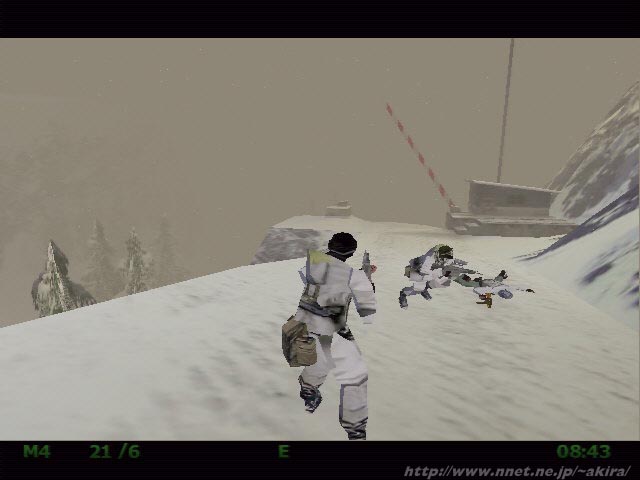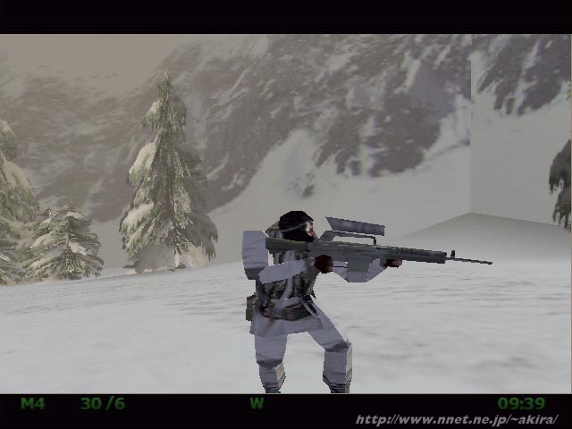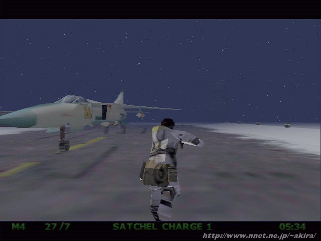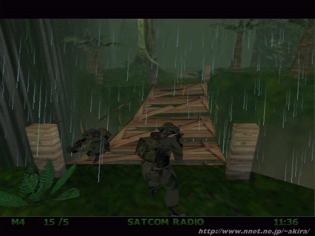しばらく歩くと、我々と同じく機体を捜査していたらしい敵兵数名と遭遇した。相棒と敵兵を蹴散らしながら先を急ぐ。今回も8分のタイムリミット付きだから、うかうかしていられない。 途中、残骸を確認しながら歩いていくと、なにやら地面に四角い小箱が置いて有るのが目に付いた。 好奇心が抑えられなくなった私は、相棒をその場に置いてその箱へと近づいた。 そして、やっとそれの全貌が見えたとき、私は自分の軽率さを後悔した。 しまった、クレイモアだ! 爆発の瞬間慌てて横に飛び退いたものの、脚部を若干だが負傷してしまった。 幸いなことに救急セットを持っていたので、応急処置後また相棒と捜索を続行することにする。 更に数名の敵兵と交戦しながら歩いていたが、やっと機体の残骸が少なくなって来たようだ。 そして注意深く周囲を見渡すと、ようやくお目当てのシャトルの機首部分を見つけることが出来た。 しかし機首の周辺だけあって、やはり敵兵も大勢周囲に潜んでいるようだ。 それから数分後、周囲を掃討して相棒に援護を任せた後、私は機首に格納されたデータボックスの回収作業にあたった。 キーを回して機首の格納ハッチを開くと、やっとお目当てのデータボックスのお出ましだ。 これを回収すれば、もうここには用はない。 急いでサチェル・チャージを機首の下部にセットし、私たちはシャトルの残骸を後にし退避。 完全に機首を破壊したのを確認し、私は任務終了の無線連絡を本部に入れた・・・ DEMO_Tips: DEMO版はVer1.2&1.3が“T”keyでタイマー解除、Ver1.0ではsavedata.txt削除でPhase2がプレイ可能になります。 −Spec Ops 製品版レビュー、若干の攻略− 私のゲットした国内版には、全ミッション内容とミッション背景や操作方法を完全和訳した説明書が付属しています。 このゲームはスピーチの聞き取りなどもないので、これで思う存分プレイ出来ることになります(^^; 製品版は約60MBのHDD容量を使用し、Voodoo専用3Dfx(Glide)モードと3Dカードの必要ないソフトウエアレンダリングの何れかをインストール時に選択する事になります。 DirectX5は必須ですが、セットアップ時に同時にインストールする事が可能です。 Glide版では、製品版をインストールしたデフォルト状態だとゲーム開始後真っ暗なままというバグがあるので、ZOMBIEのサイトから最新パッチをDLすることをお勧めします。 このサイトでは他にVoodoo2専用のテクスチャーパッチやOpenGLパッチもDL出来ます。 次にクリアまでの簡単なヒントなどを書きたいと思います。 計16ステージの内、私がクリアまでに手間取ったステージだけ紹介します。 −Russia Phase 2− お勧め装備:M4 or M249 対空砲を破壊しヘリの着陸地点を制圧することが目的ですが、対空砲を破壊するだけではクリア出来ません。 周囲に潜む敵兵も全て掃討する必要があります。 時間切れに注意しましょう。 −Korea Phase 3− お勧め装備:M4 4機スカッドをSATCHEL CHARGEで破壊すれば良いのですが、車体を破壊するだけではクリア出来ません。 正確にスカッド“ミサイル”を破壊する必要があります。 ですからSATCHEL CHARGEを設置する場所に注意しましょう。 これに気が付かなかったばかりに、私は何度もこのミッションをする羽目に・・・ −Korea Phase 4− お勧め装備:M4 or SSG 毒ガスプラントを3機破壊するのですが、その時に発生する毒ガスに気を付けましょう(視認可能)。 最後にヘリに搭乗して脱出するのですが、このヘリの位置はスタート地点から二番目の毒ガスプラント付近です。 −Colombia Phase 1− お勧め装備:MP5 or M249 マルコス大佐を捕縛するのが目的ですが、マルコス大佐は建物を過ぎた当たりにいます。 白っぽい服装をしているので、間違えて撃つことが無いように気を付けましょう。 しばらく追いかけると、建物の上部に追いつめることが出来ます。 後は大佐に接近接触だけで捕縛完了です。 −Colombia Phase 2− お勧め装備:M203 麻薬テロリスト集団のバラックを破壊するのが目的ですが、このミッションの難所はバラックへ行くまでのジャングルの道のりです。 特に厳しいのが橋を渡ってから(デフォルトで)左手に隠れている狙撃兵なので、M203やグレネードを敵兵が潜んでいる辺りに叩き込みましょう。 この、狙撃されたら直ぐに後退し、敵が潜んでいる辺りに(大抵は大木の裏)M203やグレネードを叩き込むのが、このジャングルの一本道では“比較的”有効な戦法のようです。 −Colombia Phase 3−