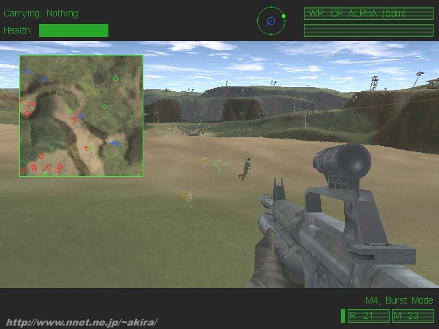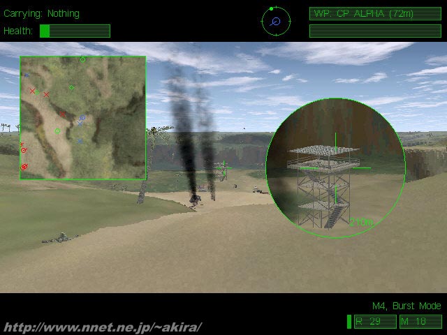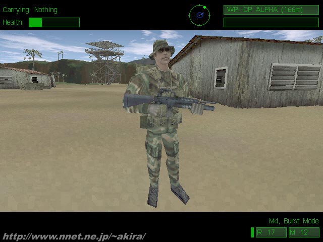 Novalogicによる3D特殊部隊アクションゲーム。DirectX対応。 SpecOps、RainbowSixと続いてNovaloicからも陸軍特殊部隊を題材としたゲームがリリースされた。 このゲームの名前はDelta Forceという実在の軍特殊部隊をテーマにしていることから来ており、実在の部隊をテーマとするだけあって、ミッション内容も現実に即したものとなっている。 グラフィックスエンジンはVoxel Spaceの改良型(更に細かいセル&64000色対応)を使用しており、今までにない細かい地形描写を行っている。 普通のゲームでは地形をポリゴンで表現しているが、このゲームはVoxel Spaceを使用することにより、テクスチャーだけでは表現できない地面の凹凸までリアルに再現できるのが特徴だ。 しかしDirect3D等のAPIを使用していないためハードウエアによる描画支援が受けられず、全てCPUパワーに頼った描画になるのが欠点で、実際200MMXで640*480*64000colorだとかなり重く感じられた。 さて肝心のゲーム内容だが、DEMOではチームの一員として南米のある麻薬密輸キャンプを強襲するミッションを遊ぶことが出来る。 DEMOではColt.45、M4、M203を装備しているが、同類のゲームに無い特徴としてナイフの実装が挙げられる。 実際に使う機会が有るかどうか疑問だが、それが生かされるミッションが有るのだろうか。 また伏せ、膝立ての他、ジャンプも出来るのが珍しいポイントだろう(何に使うんだ?)。 このゲームはSpecOps、RainbowSixとは異なりアクションゲームに位置づけられているのだが確かに作戦を立ててとか、隠密行動が、と考える必要は一切無い。 ひたすらコンパス(&レーダー)を見ながら、麻薬密輸キャンプに向かって突進するのみである(一応WayPointは有るが)。 このゲームの場合デフォルトの画面ではQuake系アクションゲームの様に、使用するウェポンのみが画面に表示されており(消すことも可能)、視点切り替えによって一人称視点から三人称視点に切り替えることが出来る。 他にもレーダーや後方視野を表示させることも出来るのだが、如何せん640*480を選択してもゲーム画面が狭いため非常に視界が悪い。 しかもスコープモードでは事も有ろうに全画面拡大ではなく、右に拡大した画像が小さく出るだけのため、マップやこのスコープ画像を表示すると視界が悪いことこの上ない(静止状態以外ではスコープが使えないのはリアル)。 また弾道が線で表示されるのだが、これがかなりゲームの品位を下げているように感じられる。 さらに遠くをちまちま動いている敵兵たちが、まるで一昔前のVGA画面のようで実に安っぽい感じだ。 音響効果もいまいちで、一体どこから撃たれているのかさっぱり解らない。 かなり遠い所からバシバシ撃たれていることもあり、リアルさの欠片も無いのではと思ってしまう。 距離に関係なく撃てるのは敵も自分も同じだと言う感じで、視界に入ればとにかく弾が届くなんて流石はアクションゲームである。 ゲームとしての完成度はともかく、とにかく遊んでいてストレスが貯まり、DEMOを遊んだだけでそのリアルさに魅了されたSpecOpsやRainbowSixの足下にも及ばないと言った感じだ。 爽快感が全くないことから、アクションゲームとしても失格だと言える。 とどめに操作性もかなり悪く、このゲームの評価を下げる原因となっている。 まさにクソゲーの称号を遠慮なく与えることの出来るゲームだと言えるだろう。 |
