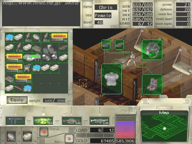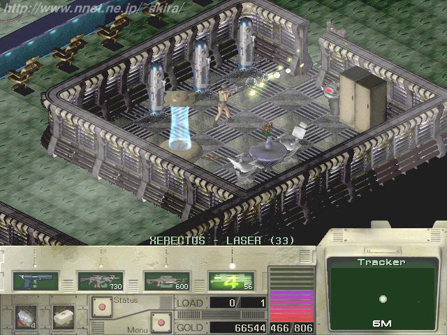 JC Researchによる2DアクションRPGゲーム。 このCybermercsはDiabloと同様のゲームシステムを採用した2DアクションRPGである。 ゲーム内容は映画エイリアンシリーズの雰囲気を漂わせており、エイリアン達に捕らわれている人間を規定数以上救出するというものになっている。 また映画エイリアンさながらに作業用モビルスーツを装着する事もでき、この状態では機体が破壊されるまで行動する事も可能。 当然装着している間は自分はダメージを受けないようになっている。 最初主人公(男か女を選べる)は貧弱なハンドガンしか所持していないが、最初のメニューで武器を購入したり、ステージに散らばっているアイテムを取得する事でパワーアップする事が可能になっている。 アイテム管理等の概念もDiabloライクで、まず所有できるアイテムは規定のマスに収まるようにしなければならないとか、自分の能力以上の武装は装着できないとか、何種類かの常備アイテムを即時切り替えて使用出来るとか、まずDiabloに慣れた人ならとまどうことなく慣れることが出来るシステムである。 またCybermercsの場合、マスのサイズに収まるかどうかだけでなく重量の概念も有り、それぞれのキャラクターが持てる重量をオーバーすると、たとえマスが埋まらなくてもそれ以上のアイテムは持てなくなってしまう。 ウェポン/アーマー等のアイテムは非常に数が多く、ハンドガン、マシンガン、レーザーガン、ショットガン、ロケットランチャーのそれぞれのジャンルにさらに複数の種類が有り、サブアイテムも含めるとかなりの数に上る。 またステージでも沢山のアイテムを収集する事が出来るので、最初は最小装備だけで臨むのも面白いかもしれない。 また持ちきれない装備は地面に置くことが出来るのもDiabloライクだ。 グラフィックスに関しては美しくレンダリングされたオブジェクトが美しく、まずまずと言える。 しかしマシンガン等を撃ったときのグラフィックスが今一で、どこに弾が飛んでいるのか解らないことが多い。 またDiabloと比べて、描画が少し引っかかるような気がする。 またマップが右下に表示されるのだが、Diabloの様にオーバーレイされる訳ではないので、狭い範囲しか表示する事が出来ない。 そのためにマップ内を意味なくうろついてしまう結果となった。 Diabloライクと言っても、このあたりはDiabloに追いついていない感じだ。 中身的にはSF版Diabloといった感じで操作体系も同じなので、Diabloにはまった人はプレイしてみる価値が有るのではないだろうか。 DEMOながらセーブ/ロードも出来るので、時間が無いが遊んでみたいという人にもお勧めできる。 |