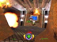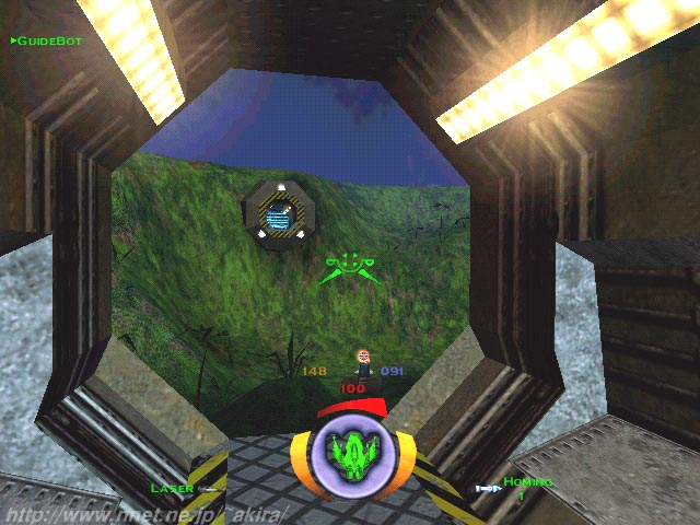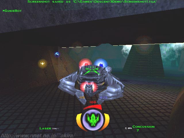 Outrage Entertainmentによる3Dアクションシューティングゲーム。Direct3D、OpenGL、Glide対応。 AT互換機のメインプロセッサーが486だった時代に一大名声を築いた3DシューティングゲームDescentの最新作が遂に登場した。 もともとこのゲームは惑星坑内での戦闘がメインだったのだが、最近リリースされたDescent: FreeSpaceはWCライクなスペースシューティングだったため、元祖の閉所恐怖症を引き起こすような坑内を探索するのが病みつきになっていたり、 上下逆になった視界に完全に慣れきったDescentフリークは残念に思ったことだろう。 しかし今回は違う。 Quakeが何時までもQuakeな様に、このDescentも元祖と全く変わらない世界を最新技術でより美しく過激に味わせてくれるのだ。 当然元祖をやり込んだプレーヤーは、何の苦もなく自機を自由自在に操ることが出来るだろう。 しかし初のAT互換機がPentiumMMX以上だったというような、元祖Descentは名前しか聞いたことが無いというプレーヤーには、このゲームはちょっと辛いかもしれない。 もっともそれを考慮してか有り難いことに、元祖で大層苦しめられた今自分が天地どちらを向いているのか解らない状態から自動的に水平状態に復帰する機能が付与されている。 これが一番頭痛(本当の頭痛)の種だっただけに、元祖を結構プレイした私にも有り難い機能だ。 最近のゲームの中ではForsakenが一番Descentに近いとは思ったものだが、やはり改めてプレイすると坑道をしばらく進むだけでForsakenとは全く違う空気を感じることが出来たのは驚きだ。 さて最初のリリースから結構経っているだけに、3Dグラフィックス面での進化は凄まじいものがある。 通路などに張られたテクスチャーも非常に繊細で立体感があり、照明等のエフェクトもリアル。 また隔壁が開くときにも新しいギミックが取り入れられており、さらにSFライクになって格好良い感じだ。 他にも随所でセンスの向上を感じ取ることが出来る(笑)。 しかし一番驚くのはオブジェクトが爆発した時のエフェクトではないだろうか。 実に爆炎が鮮やかで、まるで映画の一シーンの様にリアルである。 グラフィックス以外でも、このDEMOでは途中で屋外に出る事ができ、雷雲が上空を渦巻く様を見ることが出来たり閉所恐怖症気味の人でもホッと一息つく事が出来る空間になっている。 しかし直ぐに誘導ミサイルが自機目がけて飛んでくるので、あまりゆっくりは出来ないのだが(笑)。 敵機も大幅リニューアルされたようで、元祖と同タイプの敵機は見あたらなかった。 プレイしていて目新しかった敵機はポリス(ガードロボ?しかもカメ?)タイプのもので、なんとミサイル等での攻撃では無くひたすら殴りかかって来るというユニークでユーモラスな動作が印象的だった(たまに回し蹴りも・・・)。 このDEMOではグラフィックスの進歩等色々見るべき点は多いのだが、残念なことに肝心のセーブ機能が無いのが惜しまれる。 さらに重大な事に、このDEMOでは肝心の3Dマップが付属していないのだ。 これが無いためにDEMOのプレイが非常に苦痛なものになってしまった。 予想外に酔いはしなかったものの、これは残念だった。 しかし他のオプション設定等は省かれてはいないので、その辺りは流石大手のDEMOと言った感じだ。 |