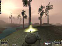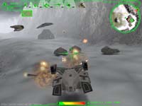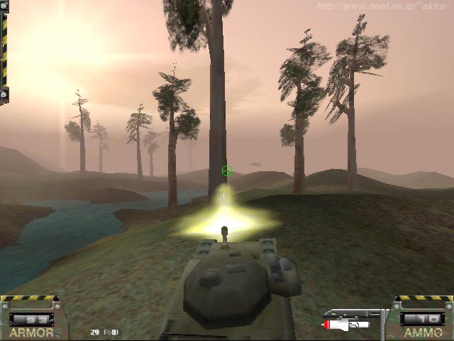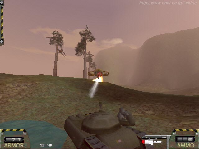 ElectroTech Multimedia による3Dシューティングゲーム。Glide専用。 聞いたことも無いメーカーの聞いたこともないタイトル。 しかもタイトルからいきなりゲームが開始、かなりB級的香りが漂うソフトだ(笑)。 しかしゲーム開始後直ぐに美しい太陽のグラフィックスに目を奪われる。 うーん、ビューティフル。他のソフトもコレくらい美しく表現して欲しいものだ。 しかしレンズフレアの類が無いのは寂しいかもしれない。 このゲームは基本的にタンクゲームなのだが、シミュレーションの要素はWargasmの尻尾程も無い、純粋なアーケードスタイルのゲームだ。 あのお気に入りDEMO、Recoilとプレイ感覚は殆ど同じである。 操作方法も殆ど同じでキー操作で車両のコントロール、マウスで砲塔のコントロール、マウス右ボタンでミサイル発射、左ボタンで主砲発射と直感でコントロールでき、直ぐに馴染みやすい操作体系なのが嬉しい。 DEMOのミッションは比較的小さなフィールドで敵の基地を最終的に破壊するものだが、各所にアイテムが隠されていたり簡単には基地に侵入できなかったりと、小さなフィールドながらなかなか面白いと思えるものだった。 また敵機をレーダーで捕捉する手段が無く、基本的に目視のみというシステムも狭いフィールドでのプレイには合っている感じだ。 他には車体の操作に慣性がかかっていたり、地形によってはなかなか進まないという割にはナゼか水陸関係なく走行出来たり、細かいところでいろいろ面白いソフトである。 容量も最近のDEMOの中では小さい方だし、ちょっとした暇の間にプレイできるお手軽さが魅力かもしれない。 |
