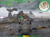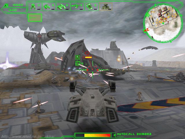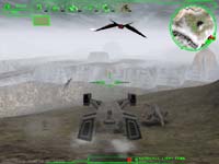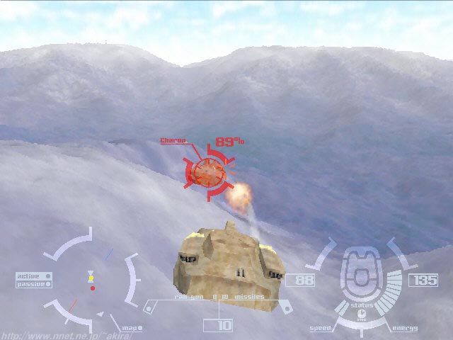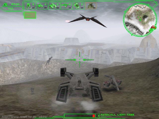 Interactive Magicによる3Dシューティングゲーム。汎用3DAPIは使用していない。 まず驚くのは、プレイして直ぐに「元、元祖コマンチ!!」と思わせる、オリジナル感漂うグラフィックスだろう(笑)。 Readmeに何の記述も無いのだが、もしかして本当にVoxcelSpaceなのだろうか。それともIAFの様なオリジナルのグラフィックスエンジンなのだろうか。 とにかくDirect3DやGlide等の3DAPIを使用していないことだけは確かなようだ(笑)。 さて640*480ながらどう見ても元祖コマンチなみにしか見えないグラフィックスで、如何にもな色彩のテクスチャーを高低差データーを元に、適当に盛り上げてみましたぁ〜的地形。 さらに自機は訳の分からな、ダサイデザインのホバータンク(笑)。 しかも敵は施設も敵機も、アカ、あか、赤ぁ〜!!(爆)。おまえらレンガか〜!! しかもウロウロしていると寮機が勝手にクリアしちまうっ!!(笑)。 うーん、なんて素晴らしいゲームなんだ。 なんか製品版が見たくなってしまった(笑)。 しかしなんだかんだ言って結構嫌いでは無いノリのソフトで、しばらくHDDに居座っていました(笑)。 さすがI Magic。 |