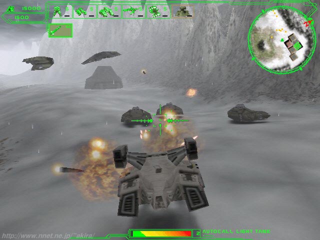 3DOによる3Dアクションシューティングゲーム。Glide対応。 一見ただのタンクアクションゲームの様に見える、リアルタイムストラテジーゲーム(笑)。 基本は敵に占有されているサイトを、自分の陣営のものにするというまさにストラテジー的なものだ。 しかし結局占有されているサイトから敵を排除するために、ホバータンクに乗り込み単身敵地へ乗り込むというタンクアクションゲームがメインをなっている。 プレーヤーが操作できるタンクには、メインにキャノン、サブに誘導ミサイルが備わっている。 しかしキャノンは今一照準が甘いし威力も弱く、ミサイルはヘルファイヤーの様に飛行目標には届かないという、なかなか貧弱なものになっている。 もっともこのミサイルは地上目標には威力が高く弾数も多いので、硬い敵にはミサイルが良く役に立つ。 逆にキャノンのみでは敵を破壊するのが容易ではないため、ミサイルを切らすと痛い目に遭うことになる。 このタンクの他に、サイトに設置されたタワーにも乗り移って攻撃する事が出来る。 このタワーの攻撃力は絶大で頼もしい防御力なのだが、如何せん移動できないのが玉に傷だ(笑)。 他応援要員として、タンクや歩兵、ミサイルサイト、航空機を配備する事が出来るので、この辺りはストラテジーの要素になるだろう。 もっともストラテジーものにありがちな細かいシステムが今一詳しく説明されていないので(説明されていても理解できるかどうか(笑))、敵を全滅しただけではクリア出来ないのが困りものだ。 また敵の司令塔の様なものを占領しなければ続々と敵施設が復活するので、恐らく単体での特攻を行うものではないと思うのだが、ナゼか味方の戦力を使用する方法が解らず結局単体で特攻してしまった(たまに助けに来てくれているようだけど(笑))。 まあ、その緊張感がこのゲームの醍醐味といえば醍醐味なのだが(本当か?)。 サウンドやグラフィックスも結構良い線いっている。 恐らくこのUprising 2も前作同様に完全日本語化されると思うので、購入するのはそれからが良いかもしれないな(誰が?)。 |