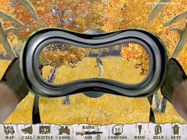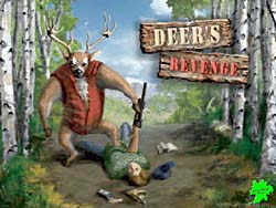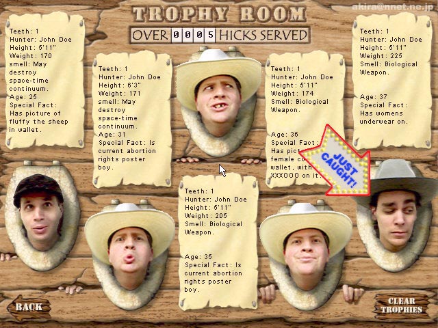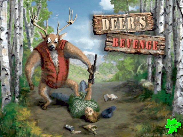 ValuSoftによる2Dアクションゲーム。 このゲームはDeer HunterやField & Stream Trophy Buckで狩られる側になることに辟易した鹿が、遂に人間を狩る側に回ってしまうゲームである(笑)。 基本的な画面やゲーム方法はDeer HunterやField & Stream Trophy Buckと同様で、 声や音を発生するアイテムで鹿ならぬ人間をおびき寄せ、ビール弾やネット弾で人間を捕獲するのである。 このアイテムを使うと、このゲームが殺伐とした人間狩りゲームでは無く、ギャグゲーで有ることが明らかになる(笑)。 ホーンの様なものを使うと、「助けて〜」とか「ヤッホー」とか言い出すし、カセットの様なものを使うとブタの鳴き声やビリヤードの音、ビールを注ぐ音、車のエンジン音などが鳴り出してしまう。 そしてその音につられた酔っぱらいや、鹿ハンター達が近づいてきたところでネットをバッサリとかぶせ、捕獲するのである。 捕獲した後も面白い。 鹿の頭を飾るようなものが有るので、「こ、これは酷い・・・」と思いきや、なんとそれは壁に掛けられた使い古しの便器(爆)。 それに酔っぱらいなどのうるさい人間を突っ込ませているのである。 この人間達が本当にうるさい(笑)。 「腹が減った」だの、「なんか雑誌よこせ」だの、さらによっぱらっているもんだから訳の解らないことをわめいていたり、ろれつの回らない言葉でカントリーソングを延々と歌ったり、捕まえた当人(当鹿?)もキレそうになる有様である(笑)。 この鹿に捕まったおっさん達の表情がこれまた笑いを誘う。 どう見ても3流コメディアンを集めてきた的なおっさんばかりで、もはやこのゲームは、お笑いを取るためのギャグゲー以外の何者でも無い事が解る。 しかも本家Deer HunterやField & Stream Trophy Buckが3Dフィールドで有るのに対し、どうやらこのゲームは景色が鹿を中心にスクロールするだけの単純な2Dゲームのようだ。 近寄ってくる人間も突然画面から現れるし、消えるときも突然消える(笑)。 確かにDeer Hunter同様安い値段で買えるのだろうが、逆狩りDOOM系を期待した人は思いっきり脱力すること間違いない。 このDEMOをプレイした上で製品版を購入したいと思う人は・・・結構いるかもしれない(笑)。 まあ酔っぱらいを捕まえたりして、仕事の合間にストレス発散する事ぐらいには役に立ちそうなゲームだと言える。 |
