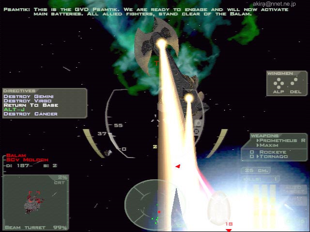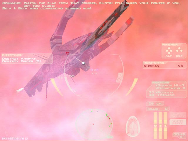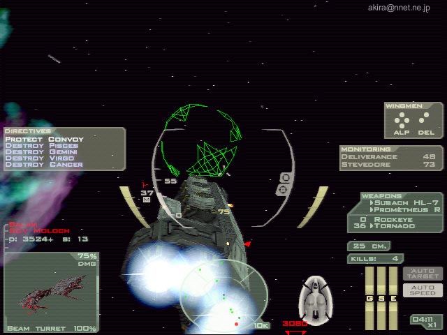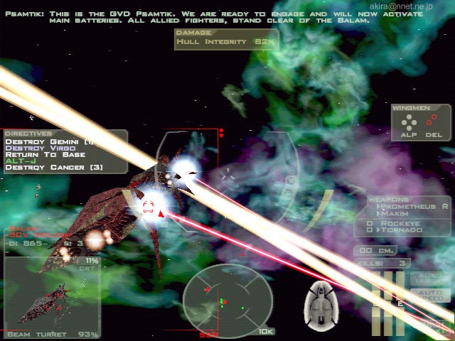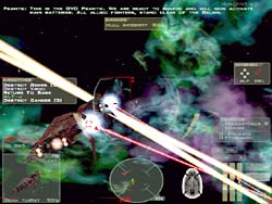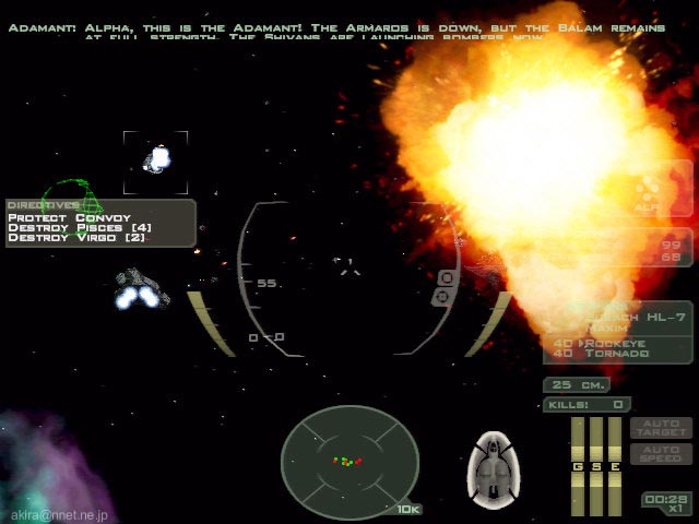 Volition Inc. による3Dスペースシューティングシミュレーションゲーム。Direct3D/Glide/EAX対応。 このゲームは、クールなスペースシューティングとしてヒットした“Descent: FreeSpace”の最新作です。 ゲームの内容自体は基本的に前作より大差有りません。 相変わらず美しいスペース空間を表現しており、爆発やレーザーの表現も映画的なリアルさです。 また前作で衝撃を受けた、ブースター使用時の加速感も相変わらず素晴らしく、しかも今回はメインウェポンをヘビーにすると、射撃時にまで機体に反動によるブレが感じられる始末です。 マクロスばりのミサイルバースト発射も健在で、前作を楽しんだ人には嬉しい限りでしょう。 このDEMOではトレーニングを含む、3つのミッションをプレイする事が可能で、前作同様レーニングは教官機に従い、親切な解説によりFS2の世界に慣れ親しむ事ができる様になっています。 しかしFS2は操作体系共々殆ど前作と共通ですし、この手のスペースシューティングゲームに慣れている人なら、さっさと実戦ミッションにに移った方が良いでしょう。 相変わらずシューティングと銘打ちながらも、実際にはフライトシムクラスの複雑な操作体系を持っており、これを全て覚え使いこなすにはかなりの熟練を要します。 しかしSideWinder Precision Proの様なジョイスティックなら、主要な操作の殆どをスティックで行うことができ便利です。 ただし、なぜかスロットル系がSideWinder Precision Proのスロットルにアサインできませんでした。 もっとも実際にはオートスピードマッチングをONにしておけば、後は必要な時にブースターを使用すれば事足ります。 ちなみにSideWinder Game Padも使用してみましたが、流石にデジタルパッドだと微妙な照準合わせが出来なかったので、これはお勧めできません。 またDEMOながら相変わらずオプション類はビデオ、コントロール、サウンド、ゲームと揃っており、さらに各項目とも詳細な設定が可能です。 本当に前作共々丁寧な造りになっており、感心してしまいます。 もっともTNT2Uでプレイしようとすると、なぜか1024x768x32bitが標準でセットされてしまいます(笑)。 他には640x480の解像度しか選べないのは、逆に今時のDEMOでは珍しいですね。 さて今回の売りは、なんと言っても巨大な艦船同士の艦砲射撃戦でしょう。 これは実戦ミッション2で見ることができます。 真っ黒な宇宙空間に、赤や緑の極太高出力ビームが飛び交う様はまさに圧巻です。 ちなみにこの実戦ミッション2では味方のトランスポーターをワープゲートまでエスコートするのが任務なのですが、何度プレイしても全ての大型艦船が落とされてしまい、クリアできませんでした。 最初はてっきり敵の巨大宇宙戦艦による攻撃によって落とされているとばかり思っていたので(実際そう見える)、執拗に敵艦を攻撃していました。 しかしADAMANTの強力な艦砲射撃だからこそ、そこそこのダメージが入っているようなものの、自機戦闘機Herculess-MkIIクラスの攻撃では、まさに象に纏わり付くアブ状態です(笑)。 結局このミッションでは、この敵の巨大宇宙戦艦からの攻撃は無視して良く、実際には自分はゲートへ向け先行し、ゲート方面より何波かに分かれて襲来する、敵の別働隊を叩くのが一番の作戦のようです。 この別働隊は複数の編隊で襲来し、しかも攻撃力も巨大宇宙戦艦並みに強力なため、前もってウイングマンに自分のカバーを頼んだ方が懸命でしょう。 結局この方法で何とか味方艦船を一隻も落とされる事無く、無事エスコート任務を終了する事ができました。 また自機ではどうしようもなかった敵の巨大宇宙戦艦も、遅れて到着した味方の巨大戦艦HATSHEPSUTにより、あっさりと撃沈されてしまいました。 どうやら演出的役割だったようですね>ARMARDS(笑)。 ちなみにこのミッションをプレイすると霞んでしまう実戦ミッション1でも、赤く靄が掛かったようなガス雲のなかでの戦闘が非常に雰囲気を出しており見物です。 追加ですが、このDEMOではゲームサーバーPXOを使用したマルチプレイもサポートしており、世界中の人と対戦する事が可能になっています。 EAX対応による3Dポジショナルやリアルなサウンドエフェクトも素晴らしいですし、とにかくプレイして損のないDEMOと言うことができるでしょう。 |