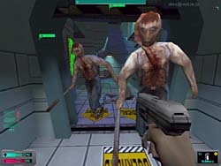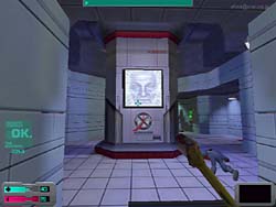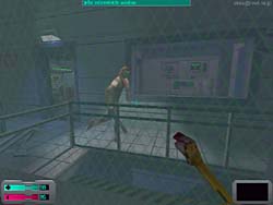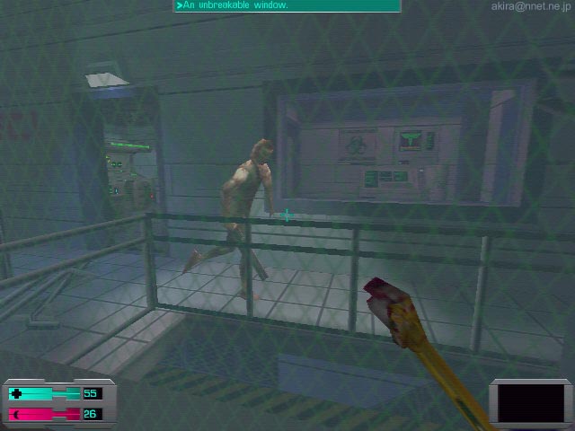 Electronic Artsによる3DアクションアドベンチャーRPGゲーム 。Direct3D/EAX対応。 このゲームはDOSアプリ全盛期時代にヒットしたSF3Dアドベンチャーゲーム“System Shock”最新作です。 ゲームの舞台は前作より35年後ですが、ゲームの造り自体も格段に進歩した3D技術の採用や、優れた3Dサウンド規格であるEAXを採用し、より未来感を醸し出しています。 DEMOながらオプション類はビデオ、コントロール、サウンド、ゲームと揃っており、さらに各項目とも詳細な設定が可能です。 またゲーム自体が単なるアクション系ではなくRPG的要素も持ち合わせているので、制限のないセーブ、ロード機能は嬉しい限りです。 さてさっそく始めると、まるでHalf-Lifeの“Hazard Course”の様なトレーニングミッションをプレイする事になります。 この時の様子もまるでHalf-Lifeの如く、モノレールで訓練施設に到着したばかりのようなシチュエーションから始まるのは、やはり大作Half-Lifeを意識しているという事なのでしょうか。 受付までに行く間には、“壮絶スタ誕生”“ハッピーヌードル”などの、日本を意識した?怪しい電光看板が目に付き、「やはり中世やファンタジー世界をモチーフにした3Dゲームより、SF的シチュエーションの3Dゲームがえ〜のぉ〜」と、後に待ちかまえている地獄を悟らせないセッティングがナイスです(笑)。 さてこのゲームは内容的にはHalf-Life系なのですが、よりRPG&ADV色が強くなっています。 その為に普通のFPS系アクションゲームとは異なり、ゲーム中で行うアクションが多様です。 例えば電子ロックキーの解除の場合、暗証番号をそこらへんに倒れている人様から回収したディスクをPDAに読み込み解読したり、E-mailで情報が届いたり、さらにはアイテムを使用してハッキングする事によっても解除可能です。 これらのアクションを十分このトレーニングコースで学ぶ事ができるのです。 さらにこのゲームの場合、RPG的要素が有ると述べたように、各種スキルの向上もゲーム中で可能になっています。 ゲーム中ではこのスキルが足りないとクリアするのに支障がでる場合もあるので(例えばハッキングスキルが足りないとキーを解除できないとか)、スキルをアップするコストの配分には注意が必要かもしれません。 ベーシック、アドバンスドの各トレーニングを終えた後は、実際のステージに入ることになります。 まず、いきなりトラブルが起きた後の様な施設に放り込まれ、何が何やらとパニックになる事必至です(笑)。 まるでHalf-Lifeでの序盤のシーンの様ですね。 その後何が原因か解らないものの死体と化した所員や、転がっているボックスからアイテムを収集しながら、マップを進んでいきます。 しかし真の恐怖とパニックはこれから訪れるのです。 まずしばらく行くと、突然女の悲鳴が窓越しに聞こえるので慌てて覗いてみると、何者かに追いかけられる女が走って行く所を目撃してしまいます。 唖然として窓の外を見続けていると、なんとも形容し難い化け物が先ほどの女性を走って追いかけて行くシーンを見てしまいます。 その後は女性の悲鳴が聞こえるのみ・・・ 気を取り直して進むも、今度は開いたドアから先を見ると、通路の奥に化け物が走り回っている姿がチラチラ見えたり・・・ どう考えても先に進みたく無くなる状況です(泣笑)。 また警報を解除しないと怒濤のように次から次へと、異形化した人間がかなりの速さで襲いかかってくるという、まさにBIOHAZARDも真っ青の恐ろしさ。 難易度をイージーにしても体力は直ぐに無くなるは、体力回復アイテムも異様に少ないは、何時までも手持ちがスパナ一本のままだで、心細さ&恐ろしさ倍増です。 壁の向こうで訳の解らない言葉で唸っている化け物の気配がしたときにはもう・・・(爆) さらにこのゲーム、EAXに対応しているため、見えないところからでも速攻で近づいてくる化け物の気配が感じられ超怖いです・・・ また化け物のAIも結構高いため、施設内に安全な場所が殆ど無いというのも恐ろしい。 ただ知恵を絞れば解決策は必ず有るので、そのあたりもHalf-Life以上に自由度が高いという印象です。 しかしHalf-Life以上に入り組んだ施設内を、ハッキングスキルなどを使いながらドアを開けたりセキュリティを解除したりと、3Dアクションよりアドベンチャー要素を重視したい人にはお勧めできるゲームです。 DEMO自体もクリアまでに結構時間が掛かりますし、セーブ機能やオプション類も豊富なのでお勧めできます。 |