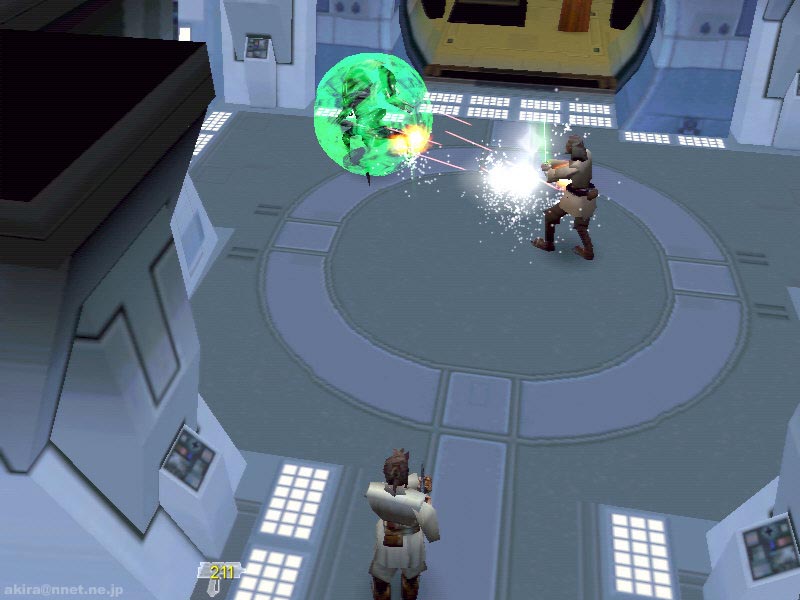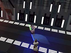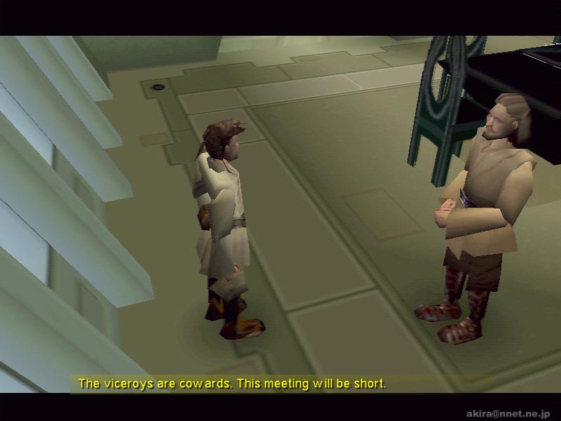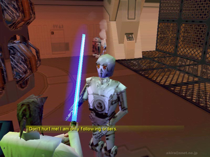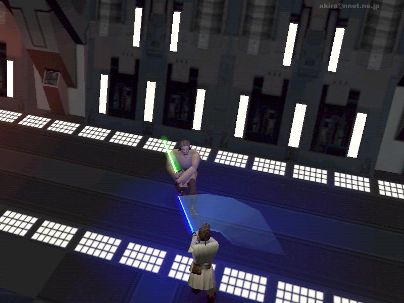 Lucas Artsによる3Dアクションアドベンチャーゲーム。Direct3D/EAX対応。 このゲームは現在絶賛上映中(米国で)のStar Wars Episode 1:The Phantom Menaceを、そのままゲームにしてしまった作品である。 プレーヤーはオビ−ワン・ケノービ、クイーン・アミダラ、クワイ−ガン・ジン等のキャラクターを操作し、Episode 1の世界を冒険する事ができる。 まだ国内では上映が始まっていないので詳しくは解らないがDEMOでプレイできる世界は、ルーク・スカイウォーカーの父アナキン・スカイウォーカーが少年時代だった時よりもさらに前、オビ−ワン・ケノービが偉大なジェダイマスターであるクワイ−ガン・ジンと共に帝国領から脱出しようとしている所から始まっているらしい(たぶん(^^;)。 まあ現時点では良く理解できない世界観はさておき、このゲームのスタイルは俯瞰タイプのアクションゲームとなっている。 一見トゥームレイダー系の3rdパーソン視点に見えるかもしれないが、視点がそれ系に比べてかなり高く、そのために天井などの視界の妨げになるものはカットされている。 この俯瞰視点でプレイしてみて感じた欠点は、ゲーム画面が如何にも箱庭的な造りになってしまい迫力に乏しくなってしまっている点と、視点が殆ど真上に近いため前方が非常に見づらいという事だろう。 そのため新しいステージに足を踏み入れるのに、やや勇気が必要だ(笑)。 逆に利点も有り、トゥームレイダー系の3rdパーソン視点の場合、狭い通路に入るとキャラクターが動き回る度に視点が激しく変わり(視点が壁にのめり込まないため)、必要以上に3D酔いする事が有るのだが、この俯瞰タイプではその様な事が一切無いのだ。 もっともキャラクターとの会話シーンではカメラが移動し、キャラクター同士のアップになる配慮はされている。 大まかな特徴はこの視点に有ると思うが、このゲームは細かい点でも見るべき点が多い。 メニュー画面では小さなウインドウで(スイッチになっている)映画のシーンを少しながら見ることが出来るし、ゲーム中でもボタンを色々触っていると警報がなり、あわててR2-D2が駆け付け警報を解除したり、通信設備をいじるとクイーン・アミダラの映像が浮かび上がったり、ライトセーバーは半透明に光って剣の周囲もぼんやり照らし出されたりと、細かな配慮が行き届いている。 音声や効果音はEAXに対応しており、まるで映画を見ているかの様な重厚感の有る会話や効果音を楽しむことが出来る。 EAXをカットした場合とEAXを有効にした時とでは、ゲームの迫力に雲泥の差があるので、是非ともEAX対応音源でプレイしてもらいたい。これは誇張ではない。 肝心のアクション部分でも、クワイ−ガン・ジンが先導してくれガードロボと戦ったり、自キャラクターのオビ−ワン・ケノービもキー操作により、まるで舞の様にライトセーバーを振るいガードロボの放つビームを跳ね返しながら斬りつけたりと、爽快感重視の造りになっており好感が持てる。 また、3D画面のままインタラクティブにストーリーが進行したり、アクションゲームとしてはやや不利な俯瞰視点という事から考えても、このゲームはストーリーとアクションをバランス良くミックスした、Star Wars Episode 1:The Phantom Menaceの世界を味わうためのゲームだと言うことができるだろう。 |