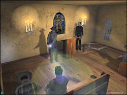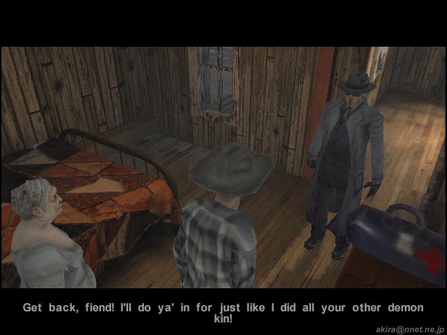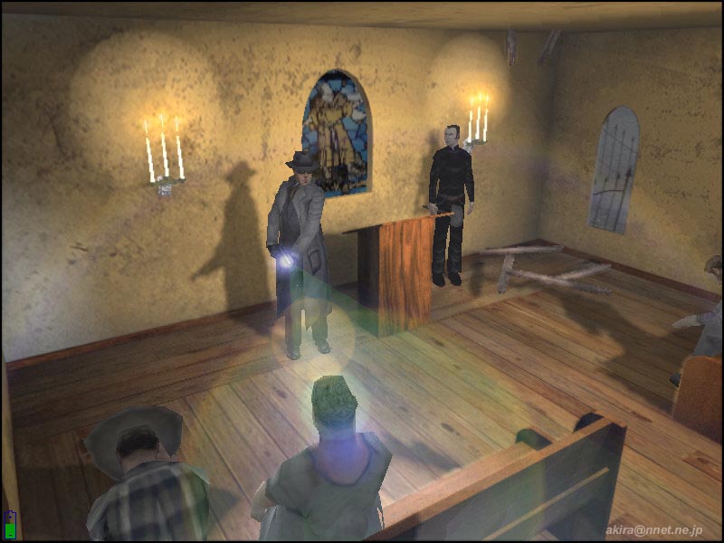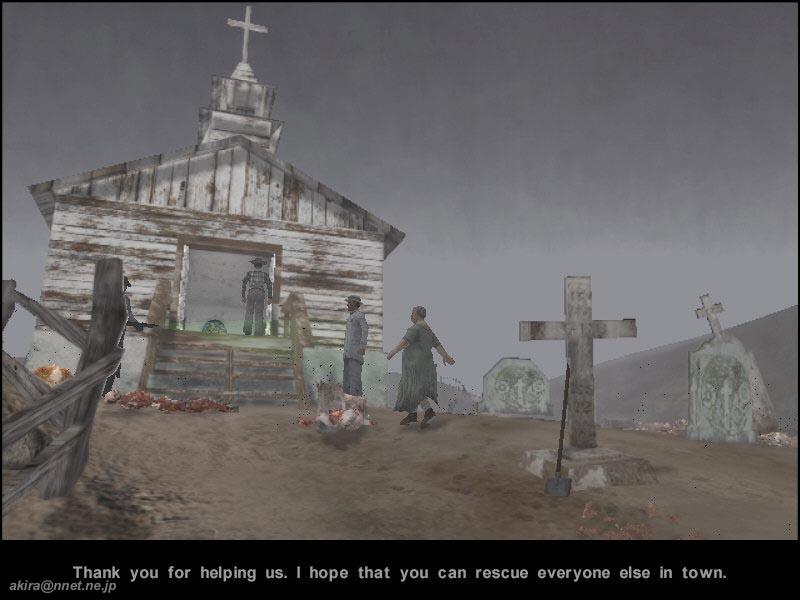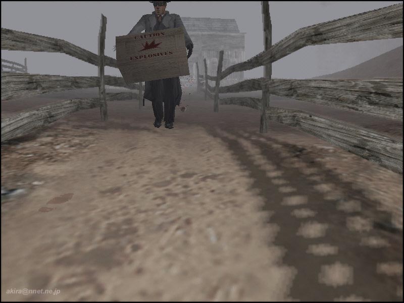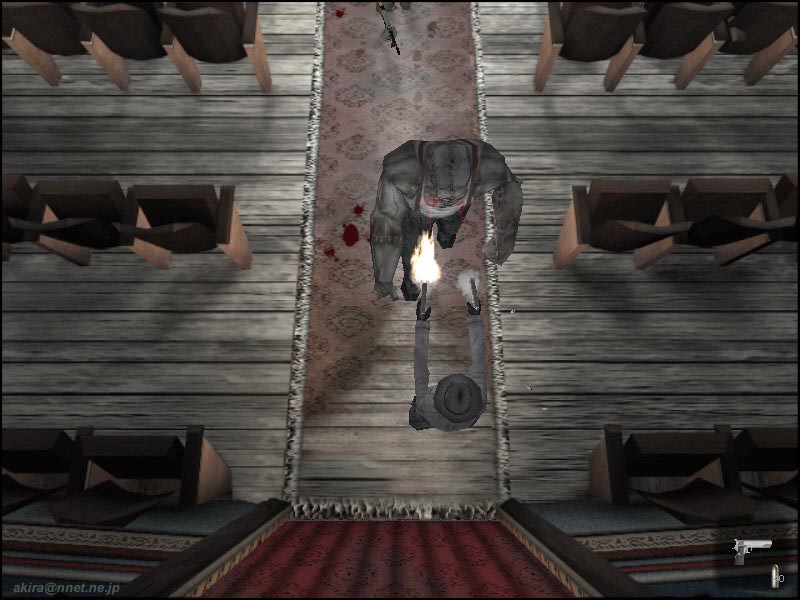 Terminal Realityによる3Dアクションアドベンチャーゲーム 。Direct3D/EAX対応。 このゲームは、いわゆるBIOHAZARD系の3D(トゥルーでは無い)アクションゲームです。 背景が固定で存在し、カメラも固定の3rdPersonViewとなっています。 カメラ固定のため、ゾンビの声が聞こえていても、姿は見えないと言う恐怖感を演出しています。 グラフィックス自体はBIOHAZARD2などが滲むほど美しく、背景と人物のマッチングにも違和感を感じません。 背景は固定なのですが、BIOHAZARDやALONE IN THE DARKシリーズのように一枚絵ではなく、ポリゴンできちんと構成されている様ですね。 また光源処理が逸品で、全ての物体に陰が付き、リアルタイムに動く物体の陰まで美しいのには驚きます。 さらに主人公の持つフラッシュライトも角度によってレンズフレアが生じたり、足跡が何時までも残っていたりと、芸が細かいですね。 3Dオブジェクト類もBIOHAZARD2以上に細かく、主人公のマント等は常に“はためいて”います。 しかしその美しさの為か、グラフィックス、サウンド共に最高に設定すると、800x600でも12fps前後という重さになっています(C450A+TNT2U)。 もっとも推奨スペック自体がPentium2〜3、Athlonで、メモリーは最小で128MB、VGAも各社最高レベルの製品に(G400やRAGE128、TNT2等)32MBのVRAMが要求されています。 実際プレイしたところ、CPUは600MHz以上、メモリーも256MBは必要な感じを受けました。 128MBではカメラ切り替えなどのシーンで、スワップのため一々待たされる感じです。 DEMOではゾンビ化していない村人を唯一の聖域である教会までエスコートするという、救出ミッションがメインとなっており、BIOHAZARD系のような謎解きの要素はあまり見られませんでした。 謎解きは有っても、せいぜい鍵を調達する時や、地下室の扉を開ける時くらいです。 しかし湧いてくるように出現するゾンビには手こずり、しかも動作が重いこともあって難易度は高い感じです。 主人公はレーザーサイト付きハンドガンx二挺とショットガン(序盤でゲット)を所持していますが、それぞれ半自動照準なのは助かります。 二挺銃は同時に二体のゾンビを攻撃可能ですし、ショットガンも有効範囲内で有れば、複数のターゲットにダメージを与えることができます。 また二挺銃のレーザーサイトは、隠れていて見えないゾンビの存在を教えてくれる、レーダーの様な役目もしてくれます。 ですが先ほど書いたとおり、ゲームが重いためキー入力のフィードバックが遅く、照準を合わせるためあたふたしている間に、ゲームオーバーする事もしばしばです。 ゲーム中は村人との会話等、重要な箇所ではシネスコサイズにゲーム画面が切り替わり自動で話が進むなど、美しい映像を生かしたゲーム造りになっています。 また主人公のガンアクションも、ロングコートからさっそうとショットガンを取り出すなど、マフィア映画さながらのかっこよさです。 薄暗がりを切り裂くようなレーザー光も格好いいの一言です。 このゲームでは弾や薬品などのアイテムは救出した人が居た家などからゲットするのですが、基本的に全てのゾンビを撃ちまくっていると、速攻で弾切れしてしまいます。 その為に、弾切れでクリア出来なくなることも有りました。 結局近場のゾンビは、教会の前にいる助っ人の所まで誘導して助っ人に倒して貰い、残りをプレーヤーが倒す方法で何とかクリアできました。 サウンド面ではEAXに対応しており、ゾンビの声から大体の居場所が解る3Dポジショナルや、カーペットやフローリングなどでリアルに足音が異なったり、狭い部屋では反響音がするなどの環境音を味わうことが出来ます。 総評としては、ぞろぞろ出現するゾンビと戦いながら、どこかに隠れている村人を救い出すスリルとリアルなゾンビの恐怖は高い評価を与えられるが、このゲームを手軽に動かすにはPentium-IIIの700MHzとGaForce256-128MBが必須?という重さを考えると★x4というとこでしょうか。 しかしDEMOサイズが109MBという大容量なのは、幾らフルボイス&綺麗なテクスチャーと言えども大きすぎると思いますね。 DEMOの長さや、ムービーがゲームエンジンを使用したもので有ることを考えると、もっと容量を小さく出来なかったものかと思います。 今回はDL中に何度もファイル破損を起こしたため、結局DL終了までに一週間近くも掛かってしまったため、特にそう感じました。 |