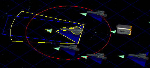 ↑緑の三角は艦隊の運動方向。青の三角は通常陣形を表し、大きさは艦隊規模を示唆。青の線はビームの射程、黄色はミサイルの射程、赤は艦載機の射程を表す。 |