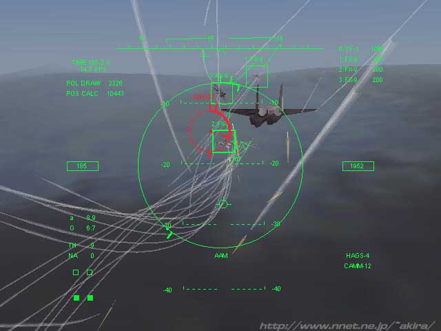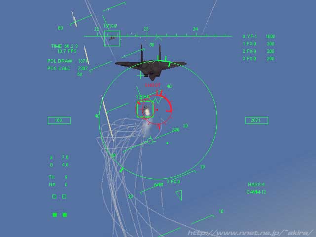 金子氏作によるフライトシミュレーター。Direct3D/Glide対応 このソフトは、 ・軌跡が美しいミサイルを実現する ・まともなフライトモデルを用いる ・リアルなHUDを実現する ・奇麗な画面を実現する ということに力を注いで作られたフライトシミュレータで、アニメ「マクロス」等で名物の、いわゆる“板野サーカス”を実現させる事にあるそうです。 操作できる機体は仮想機体YF-1で、これに搭載された同じく仮想ミサイルCAMM-12によりPC上で“板野サーカス”を拝むことが出来ます。 このYF-1はガウォークモードも搭載しており、垂直上昇も可能になっています。 実際の画面はフリーソフトとはとても思えないほど綺麗で、しかも滅茶苦茶高速な描画に驚かされます。 ゲーム内容ははアーケードのエアーコンバット風で、出現してくる敵機をひたすらバルカンとミサイルで撃破する単純明快なものです。 ロックONしバースト発射されるマイクロミサイル群を見ていると、本当にこれがフリーソフトか!?と我が目を疑うほどです。 しかし残念ながらこれはまだβバージョンで、若干のバグや音がない等の不具合は有りますが、作者の開発能力には驚くばかりです。 随時バージョンアップされているので、今後が非常に楽しみです。 |