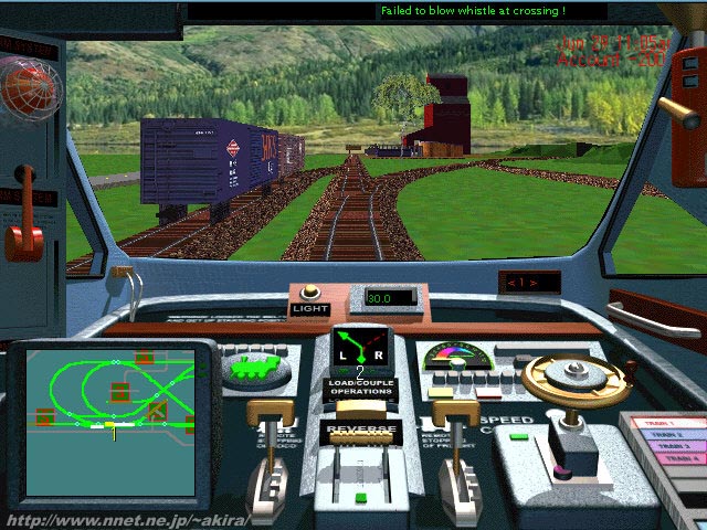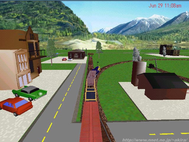 Abracadataによる、DD対応、3D列車シミュレーター アーケードの「電車でGO!」とか、いわゆるそれ系の列車シムです(^^; 特徴は3Dカードを使わないDD描画という事と(笑)、実在の地形ではなくNゲージの様に自分で線路、道路、建物などを配置しコースを造ったり出来るという点です。 そして造ったコースに自分でカメラを設置し、実際に列車が動くのを外部視点で見ながら操作することが出来る、本当にヴァーチャルNゲージといった感じです。 もちろん視点は操作席や上部視点、追尾視点など色々備わっています。 列車の操作もなかなかリアルで面白いですね。 アクセル代わりのスピードレバーや、リバースボタン、エンジンブレーキや車体ブレーキ、警笛も備わっています。 また更に面白い点として、ただ走るだけでなく配送ミッションをこなすゲームモードも有ります。 このモードでは所定の駅で荷物を受け取り、定時に他の駅に荷物を運ぶ事が出来ます。 そしてDEMOではこのモードだけを遊ぶことが出来ます。 ただこのソフト、200MMXとViRGEでは結構描画が遅く感じます。 ゆっくり走る分には気にならないのですが、飛ばすとどうしても(^^; D3D等の3DAPIに対応していないのが残念ですね。 |