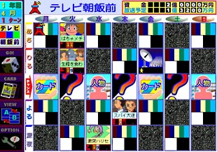 このゲームのメインとなる特徴的なボードの表示形式は三種類の中から選ぶことができ、自分が見たい情報にあわせて変更することができる。しかし内容が内容だけに情報が細かく詰め込まれているため(なにせ社長だから・・・)、最初は表示されている内容を理解しにくいだろう。 特にマニュアルを良く読まない内にプレイする人は私も含めて多いだろうから、もう少し画面中の情報が解りやすければなお良いだろう。 Helpに図入りで説明が有ったら良かったと思う(しかしHelpを読む人もあまりいないだろうな)。 さてプレイヤーが担当する局を選び早速ゲーム開始(他の3局はCPUが担当してくれる)。 この時の局名は、なかなかニヤリとするものが多い(例:落日テレビ、TV-TOUKOU)。 プレーヤーの順番が回ってきたらサイコロ(の様なもの)を振りコマを進める。