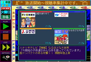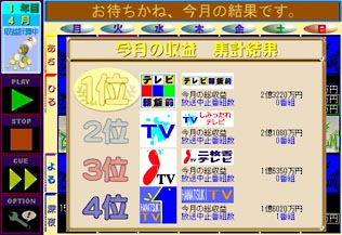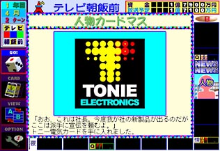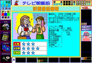 このゲームはパソコンでは珍しいボードタイプゲームで、プレーヤー(計4人)はテレビ局社長となり番組を制作する事により収入を上げ、一番多く収入を上げたプレイヤーが勝つというシステムになっている。単純(?)なモノポリータイプのPCボードゲームは多いが、恐らくこのようなタイプのゲームは初めてなのではないだろうか。 さっそくDEMOをプレイしてみたが、初めての人にもゲーム内容を理解し易いように、ゲームガイドが設けられているのが親切だ。 他、DEMOでは無いことが多いBGMも、しっかりMIDIによって演奏されている。