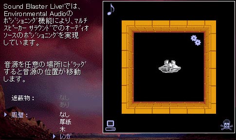 この画面では音源とリスナーとの間に、厚紙、木、レンガの隔壁を設けた場合のシミュレートを行えます。