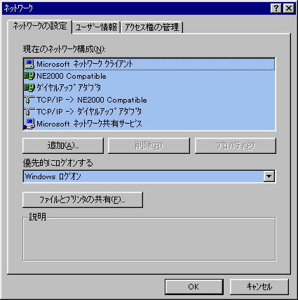 WindowsNTのドメインにログオンする→この場合はWin95どうしのピアツーピアなのでチェックオフ。