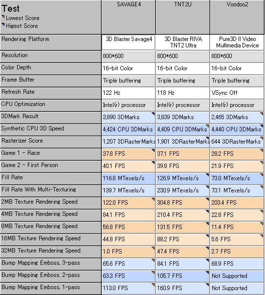実際の3Dゲームに近いGame1,2両テストではSAVAGE4がTNT2Ultraを上回ったが、SEGARALLY2などのゲームではTNT2Ultraの方がSAVAGE4より速い場面も見受けられた。