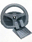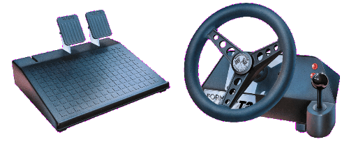 SideWinder Precision Proは、Windows 95用の高速で機敏なゲームに対応したデジタル ジョイスティックです。また、光学式トラッキング技術を採用することで、 既存のアナログ ジョイスティックに比べて、 格段に耐久性の高いハードウェアを実現しています。 SideWinder Precision Proではこの他にも改良が加えられ、 以下のような特徴を備えています。 ■操作性の向上 プレイヤーは、8個のアクション ボタン、8方向のハット スイッチ、ハンドルの回転、スロットル制御、 および、新たに追加されたシフト ボタンを使うことができます。 シフト ボタンは、今後開発されるSideWinder Precision Proのシフト ボタンに対応したゲームで使用でき、 ジョイスティックの機能を倍増することができます。 ■正確さの向上 マイクロソフトが蓄積してきた光学式トラッキング技術を改良し、従来に比較し可動範囲の広くなったハンドルの動きと、 新しいデザインのホイール型スロットルの動きを、同時に、かつ正確に捉えることができるようになっています。 ■カスタマイズ性の向上 SideWinder Precision Pro製品に同梱された新しいバージョンのソフトウェア:ゲームデバイスプロファイラを使えば、 入力タイミングの難しい複雑なキー操作をジョイスティックのボタンに簡単に割り当ててプロファイルとして保存したり、 編集してチューンナップしたプロファイルをゲーム仲間と交換することもできます。 SideWinder Precision Proのデザインは大幅に改良されており、人間工学に基づいた設計になっています。 操作性を改善するために、ボタンの配置を見直し、すべてのボタンやスロットルを操作しても指の動きは最小限に抑えられるように設計されています。 その結果、自然な操作感を実現するだけでなく、正確ですばやいコントロールが可能になりました。 感想: このスティックは、これまでの電気抵抗を利用したスティックでありがちだったドリフトや、時間経過によるズレを完全に解消した画期的なデバイスです。 これまでCHのスティックなどに採用されていたダイアルスロットルに加え、ラダー操作もグリップのツイストで実現されているため、フライトゲームでも非常に使いやすくなっています。 従来のスティック、例えばTH社のFCSスティック等は動きが非常に堅く長時間の操作には苦痛が伴いましたし、またTH商品には故障も付き物でした。 CH社のスティックは動作も軽く故障も少ないのですが、逆に軽すぎてフライトゲームでは慣れが必要でした。 個人的にはWingmanシリーズがベストだと思っていますが、こちらも電気抵抗方式に特有の問題からは逃れられません。 しかしSideWinder Precision Proは、これら全ての商品の問題を解決しています。 長時間使用しても変わらない安定性に、人間工学に基づいた操作しやすいスイッチ類、動作が軽くそれでいてしっかりした操作感のスティック。 ベースも安定した形状をしており、かなり乱暴に操作してもTHの様に本体ごと倒れたりする事はありません。 Windows時代の、ベストなジョイスティックと言うことが出来ます。 MicrosoftはOSベンダーとしてやっていけなくなっても、ハードメーカーとして十分にやっていけます(笑) 製品名:ThrustMaster Formula T2 Racing Wheel −参考小売価格 15,800円($99.95) ![]() コメント: ハンドル型コントロールデバイスとしては、世界標準とも言えるTM社Formulaシリーズの最新版だ。 前作からの主な違いは、造りが少々高級感の有る物となりハンドルがカートライクな小径でグリップがソフトなゴム質のものに変わったことと、ペダルがローラー式から実車に近いペダル式に変更されたことだろう。 また筐体はGrandprixと共通のものになっている。 残念ながらシフトレバーは相変わらずちゃちいレバー方式で、シフト感は全くない。 ハンドルと聞くとどうしても大柄な筐体を思い浮かべるだろうが、実際のT2は非常にコンパクトだ。 本体の固定は2個のクランプと吸盤でおこなうが、吸盤は当てにならずハンドルに力が入ると結構ずれてしまう。 この辺りは、クランプの設置面積を広げるなどの改善をして欲しいところだ。 シフトの他にパネルに2つのボタンが有るのだが、ゲーム中は結構押しづらく感じる。 できればGrandprixの様にハンドル側に付けてもらえれば、操作し易いだろう。 ハンドルの動作角は比較的小さく(一回転もしない)、初めて使用した友人は実車のようにハンドルを回転させようとして、ステーに何度も指をぶつけていた(笑) これは欠点ではなく、少ない曲げ角で的確な動作が出来るため私は良いと思う。 実際、高速運転中のことを思えばこれは当たり前のことでもあり、慣れの問題だろう。 ペダルは床に置くのだが、別段固定する金具などもないので床の材質によっては各自固定する必要が有るだろう。 私の場合には要らなくなった雑誌を一冊、壁とペダルのとの間に挟んで動かないようにしている(笑) ペダルの踏み心地は結構堅く、反発力が強いので長時間の使用は辛く感じる。 TM