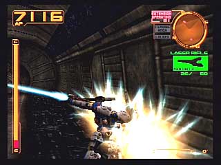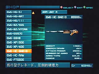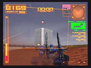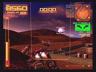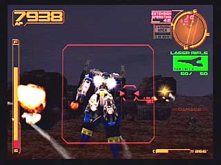 − ARMORED CORE 2 − プレーヤーはテラフォーミングにより火星に人類が移住している未来に、ARMORED COREと呼ばれる機体を操る傭兵(レイヴン)として活動する事になります。 ゲームは基本的にミッションとアリーナで成り立っています。 ミッションでは傭兵として企業に雇われて仕事をこなし、成功すれば報奨金を受け取る事ができます。 アリーナでは先輩レイヴン達と対戦し、勝ち上がる毎に賞金や賞品を受け取ることができます。 ゲームの進め方はプレーヤー次第で、まずアリーナで賞金を稼いでミッションを行う事もできますし、ミッションのみクリアしてから改めてアリーナに挑戦する事も可能です。 ところでこのゲーム、普通のロボット・アクションシューティングものと異なり、機体を組み上げるという作業がゲーム中、大きなウエイトを占めています。 プレーヤーが使用するACは様々な部品から成り立っており、頭部、コア、腕部、脚部、ジェネレーター、ラジエーター、FCS、ブースター、インサイド、エクステンション、左右肩装備、左右腕装備、オプショナルパーツという沢山の箇所を数百点ものパーツから選択して組み上げる必要が有るのです。 これらのパーツにはそれぞれ耐久力、重量、最大荷重、消費エネルギー他多岐に渡る詳細なパラメーターが有り、良いパーツはやはり値段もそれなりに高値になっています。 これらのパラメーターや部品の形状、種類などのデータについては、とても一個人のサイトで書ききれる量では無い程膨大なものがありますが、それらを把握しつつミッションや対戦相手に最適な機体を組み上げるのが、このゲーム最大の醍醐味のような気がします。 例えば技術の無いパイロットでも、最適な機体でミッションorアリーナに望めば、かなりの確率で完遂or勝利する事ができる程機体組み上げは大きなウエイトを占めています。 もし操縦テクニックが高いプレーヤーなら、相手が重量級タンク+キャノン系装備だった場合、軽量級二脚+マシンガンの機体で相手を翻弄しつつAPを削っていくという戦術が使えますし、逆に腕に自信がないプレーヤーなら相手の隙を突くような機体、例えばミサイルメインの軽量機体が相手の場合、ミサイル迎撃装備+重装甲タンク+グレネード系大火力で楽に勝てる事が有ります。 しかしこれらのデーターや機体操作の説明を行うはずの付属マニュアルはとても貧粗且つ役に立たない代物で、詳細なパーツ説明、戦術説明のあるオフィシャルガイドブックは必須な様な気がします(笑)。 またミッションの各ステージには隠しパーツが多数存在するのですが、それらの殆どは到底まともにプレイしていては発見不可能に思えるものばかりで、どうもガイドブックを持たない者は損して当然みたいな感じを受けるのは私だけでしょうか。 ていうか隠しパーツを隠しすぎ!?(笑) もしガイドブック無しでミッションを軽々クリア、隠しパーツも簡単に見つけたゼ!見たいな人が居れば、きっとその人はニュータイプに違い有りません(爆)。 実際のゲームプレイですが、OPはフルCGで格好いいのですが、その後の引きがかなり弱い印象が有ります。 ストーリー性は無くは無いのですが、殆ど感情移入させようと言う工夫が有りませんし、またそれが語られていることも無く、まあ無きに等しいという感じです(笑)。 結局無味乾燥なプレイに成るわけですが、時折来るメールが少しは刺激になるという感じでしょうか。 プレイした感じ全体的に淡泊な感じで、データ命的な要素も多く、コンシューマゲームには珍しく硬派というか、メーカーがこだわって作ったという印象も受けました。 と言ってもPS2でプレイしたゲームでは初めて激しい駒落ちを経験し、それ程美麗という画面でもないのになぜ!?と思う事も有りました。 CPUパワーに余裕が有るときはFSAAを行い、処理が重くなるとFSAAを外すなどの対策も行っている感じですが、やはりソフトウエア的にまだPS2に最適化されていないのでしょうか・・・ また今現在なぜか右肩装備が使えないとか(まさか一度クリアしたプレーヤーへのハンディキャップ?)、たまにハングアップするとか言う事も有ります。 操作体系も、ロックオン対象を中心に自機を機動させるシステムを採用しているガンダムやZ.O.Eと比べるとかなり使いづらい印象で、せっかくのスティックも何にも生かされていないのが残念です。 前でも書いていますが全体的にユーザーフレンドリーさに欠けている印象を受けたのは残念です。 悪く言えば独りよがりなシステムというか・・・ 良く取れば前作のフアンの為に最適化されているというか。 しかしそれ以外ではやはり機体組み上げ作業がかなり面白く、対戦相手機体の特徴を考えながら効果的なパーツの組み合わせを考えたり、慣れにくい操作系も慣れればそれなりにアクションを取れるようになる事から、このゲーム自体の評価は結構自分の中では高くなっています。 アリーナ限定ながらリプレイが有